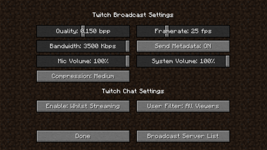 Native Twitch.tv integration was added in snapshot 13w47a for 1.7.4, and was removed in snapshot 15w31a for 1.9. It integrated Twitch chat into the game.