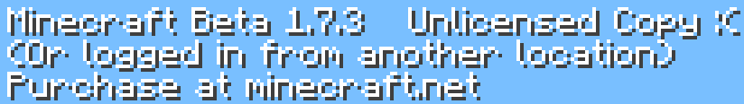 In the Beta stage of Minecraft's development, a message reading "Minecraft Beta #.#.#(_0#) Unlicensed Copy :( (Or logged in from another location). Purchase at minecraft.net" was shown in the top-left corner. This message can be seen only in versions between Beta 1.6 Test Build 3 and Beta 1.7.3, as proven by a bytecode editor. The bytecode for the message was removed in Beta 1.8.