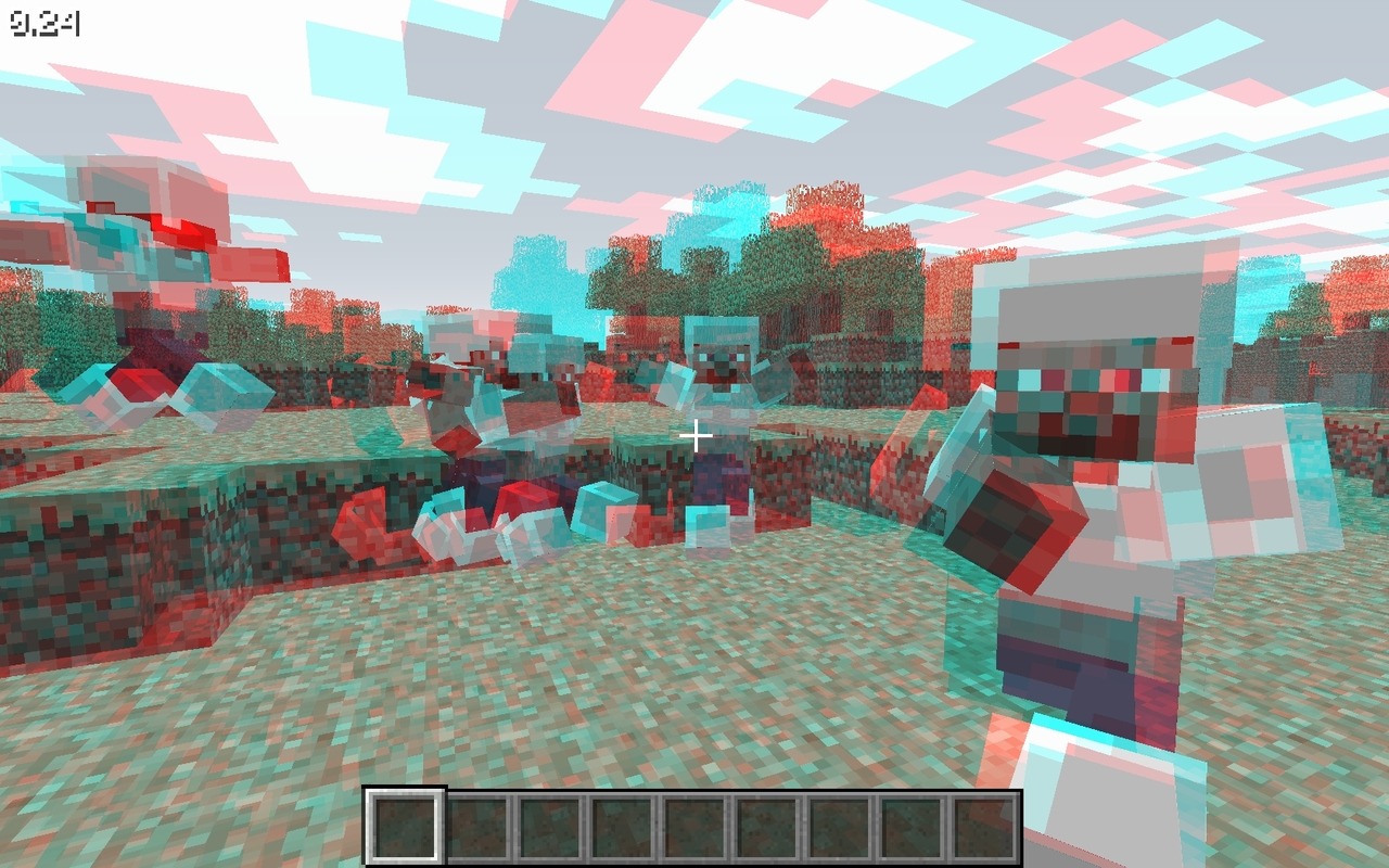 "3D Anaglyph" is an option in video settings that applies a red-cyan stereoscopic effect, enabling the use of red-cyan 3D glasses to experience the game in more depth. This option was removed in snapshot 17w43a for 1.13 due to 3D glasses becoming less popular.[citation needed]