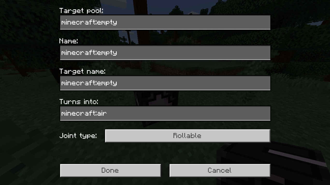 - Rollable: When generated, the jigsaw block randomly places the targeted structure or entity within the boundary of the structure block on the same XZ axis the jigsaw block is facing. Defaults to this.