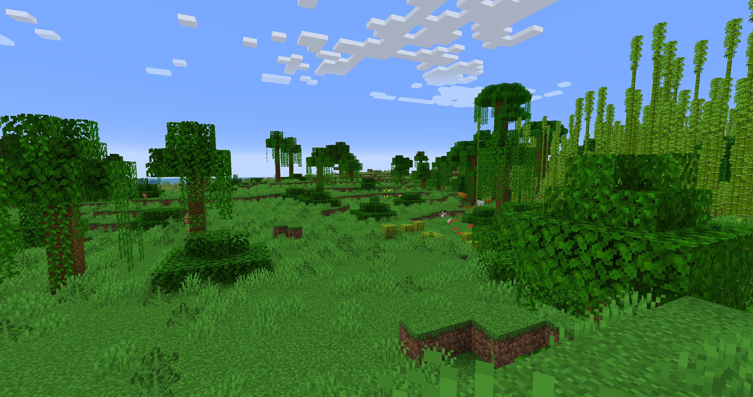 The bamboo jungle is a variant with dense bamboos. Oak trees, jungle trees, and jungle bushes are much less dense in this variant than in the regular jungle, and more dense to the sparse jungle, but boasts countless amounts of bamboo across its landscape. Patched melons are as common as in regular variants. Some swaths of grass blocks are replaced with podzol, similarly to old growth taigas. Naturally-generated trees are large variants; only 2×2 jungle trees and large, branching oak trees may generate, though many of the oaks are simply small "balloon" oaks. Cocoa beans cannot be found here, since they generate only on small jungle trees. All jungle-exclusive mobs spawn here. Pandas have a higher spawn rate in bamboo jungle than in regular jungle. Jungle pyramids may spawn here in Java Edition, whereas there are no jungle pyramids in Bedrock Edition.