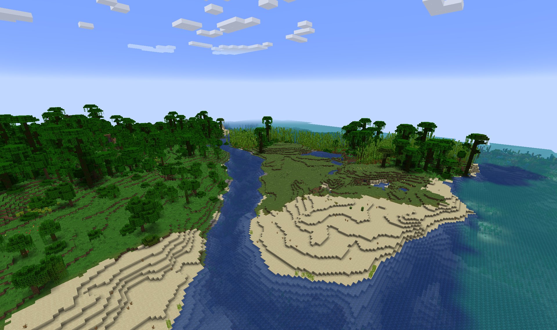 Jungles are usually bordered by forests, plains, but also often border deserts, birch forests and dark forests. Regular jungles are often separated from sparse jungles or bamboo jungles by rivers.
