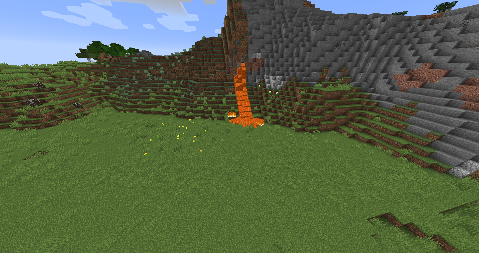 Lava can also occur as lava flows from a single spring block, pouring down walls into pools. The spring block can be on the side of a cave, ravine, mineshaft, or stone cliff above ground.