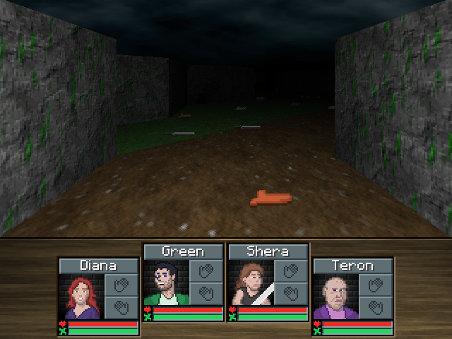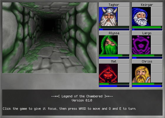 Legend of the Chambered 1 begins in a stone chamber with the word "Welcome" written on one wall. There are more winding stone chambers that need to be explored. The player soon finds a small side-room in the hall with a pile of equipment on the floor, enough for the entire team, with some text above it saying "Loot".