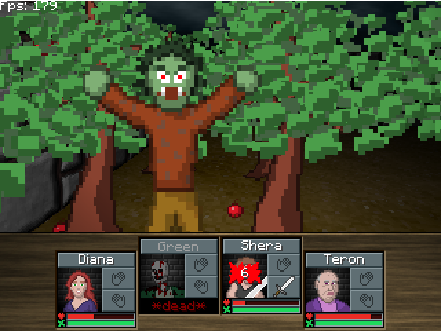 There is also another automatic door inside this room which leads to the woods (another roofless room with a maze of trees) as is suggested by some text saying "woods" on a wall somewhere inside it. Another wall on the opposite side has the words "Monsters" and "(dancing)" written on it. There are five monsters roaming around in these woods. Some of the trees have apples growing on them that can be picked by clicking on them, and many of the trees have apples piled underneath.