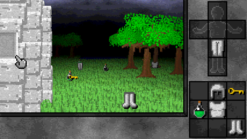 Legend of the Chambered 2 begins in a crevasse of stone walls open to the night sky. Equipment is scattered about on the ground, which the player can pick up and use. An opening to the left has studded boots and a leather shirt on the ground. Trees block the way past the opening. The player can either choose to descend the stairway leading down into the dungeon, or to follow a dirt path.