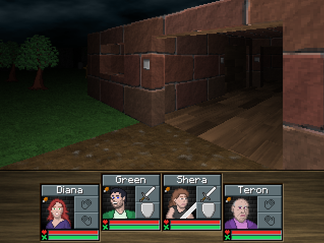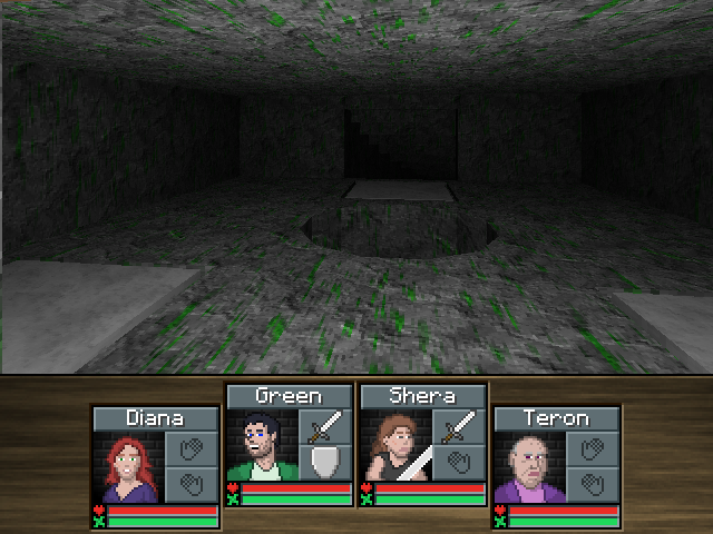 The player finds an intersection; going left, the player finds another, and going left again there is a square loop in which there is a niche in one of the walls. Going the other way there is a roofless room with an automatic wood door to it which continuously opens and closes, and some text on the wall next to it saying "(dancing)". Inside are two apple trees and two monsters. Going right from the first intersection is a room with a pentagonal stone pressure plate in the middle, and two stair wells behind it, one going up and one going down, with some text on a wall between them saying "Stairs". The player can't go up or down these stairs because of an invisible barrier.