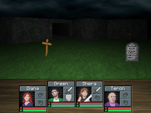 In the dungeon, two halls lead to the left and right with the staircase at the player's back. The halls meet up again with two wooden doors. Behind each door is a spider and rooms of marble. Each room conjoins into another marble room held up by marble pillars. At the end of the room, there are gravestones. Leaving the dungeon always brings the player back to the starting path no matter which entrance was taken.