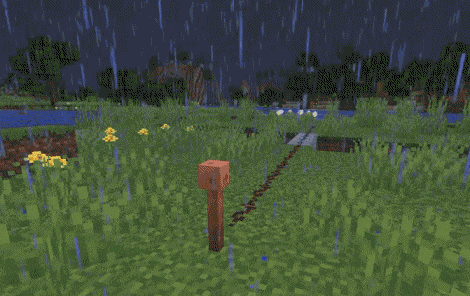 Lightning can also strike a lightning rod hit by a trident enchanted with Channeling during a thunderstorm, even if there are solid blocks above it blocking rainfall, as long as all the blocks are fully transparent (sky light level 15 at rod position). Lightning rods do not divert the lightning created by a Channeling trident thrown at an entity, or the lightning summoned by commands.