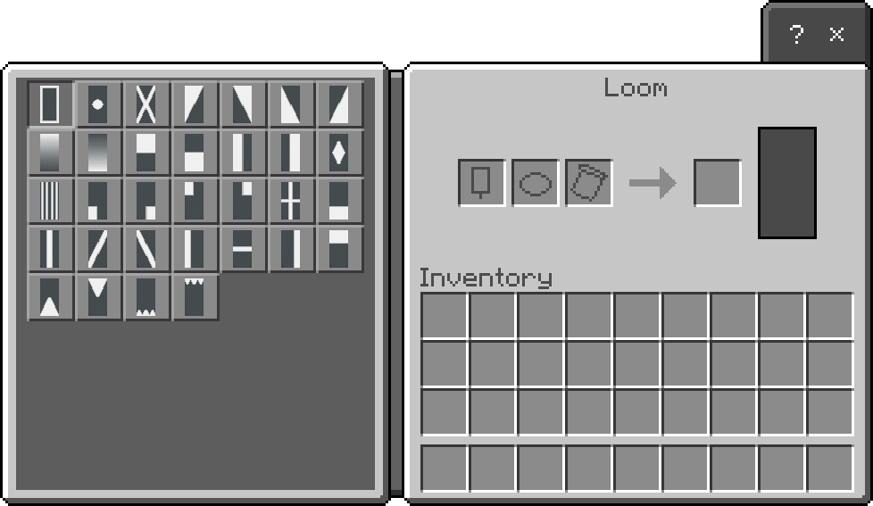 Using on a loom opens its interface. It has 3 slots for a banner, a dye and an optional banner pattern item. When a banner is put in, a list of patterns appears in the center part. 6[Java Edition only] or 8 patterns require the following banner patterns: Flower Charge, Creeper Charge, Skull Charge, Thing, Snout, Globe, Field Masoned,[Bedrock Edition only] and Bordure Indented.[Bedrock Edition only] Putting a banner pattern in its respective slot makes the loom show only that pattern.