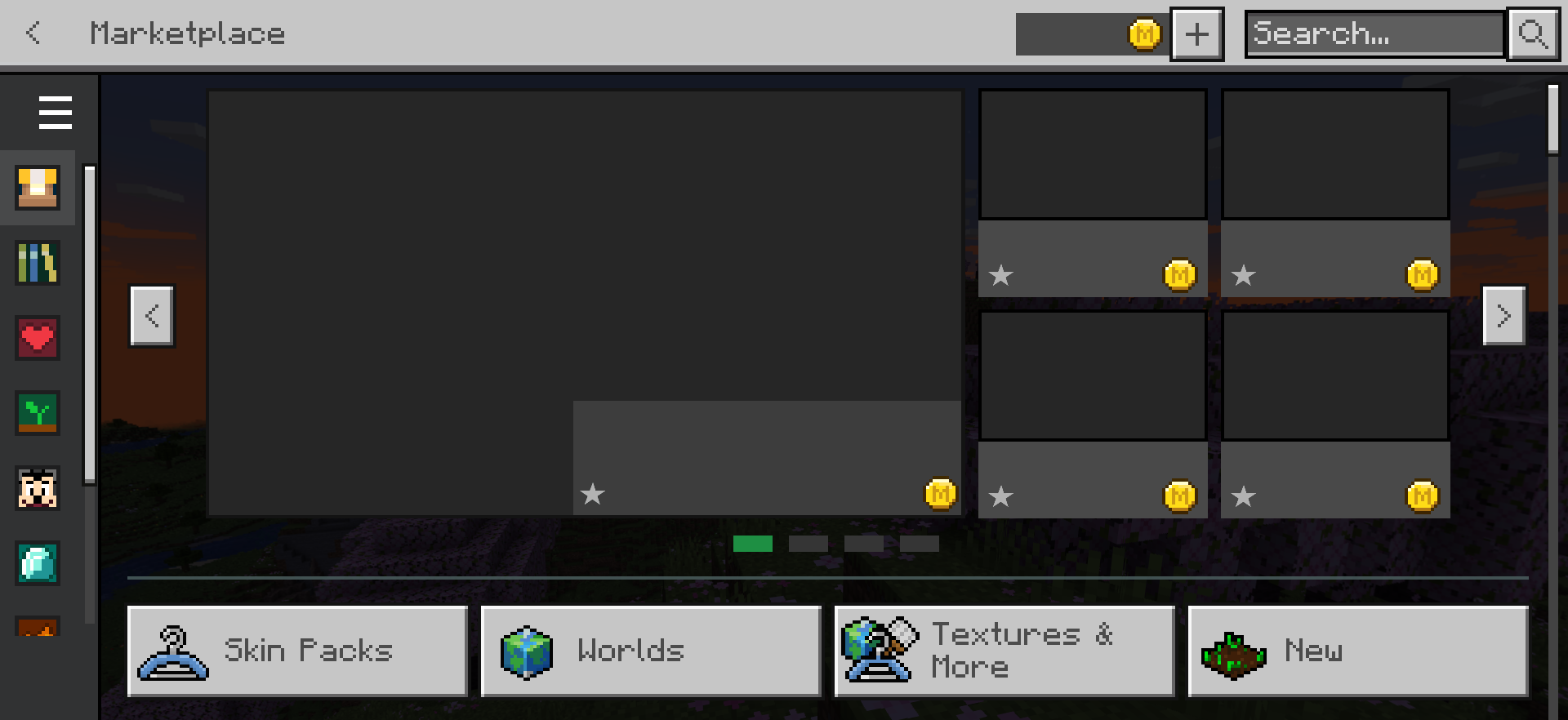 The Marketplace is a partner program between Microsoft and content creators.[1] The Marketplace is an in-game store, where players can purchase access to skins, textures and worlds from community creators, who in turn will be reimbursed for their creations. Players can access these by spending Minecraft Coins, which can be bought with their own currency.