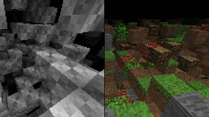 The graphics appear pixelated as a result of the game rendering at a low resolution. Even when running at a higher resolution, the game does not scale the resolution properly and the noisy appearance is retained. Block textures are similar to those used in Classic, as Classic 0.30 (Creative) was the most recent version of Minecraft at the time. Most blocks appear noisier than their Minecraft counterparts, although some blocks, especially stone, are very different. The sky is black due to the lack of a skybox.
