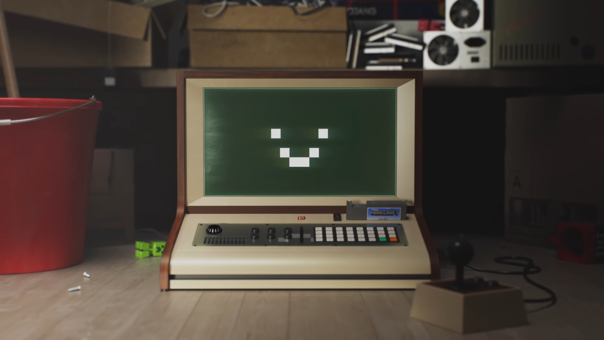 MARILLA is an old box computer with a creamy tan colored base, dark brown casing, a green and white screen, a gray keyboard and a "Team Player Mode" switch on the back. A ROM cartridge with Minecraft on it can be seen sticking out and a joystick sitting at the side connected by a cable. She is able to run programs such as Minecraft on herself.