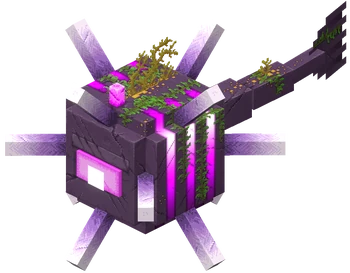 The Ancient Guardian is an oversized Elder Guardian with a predominantly dark purple body, as well as three pink stripes. All of its spikes are a light purple to white gradient, and its eye is pink in color with a white iris. On its back are a few patches of algae, coral and seaweed, with some on its tail. In front of the algae, the orb’s shard appears to be lodged into its body. Its face is full of cracks and a long scratch is seen across its eye.