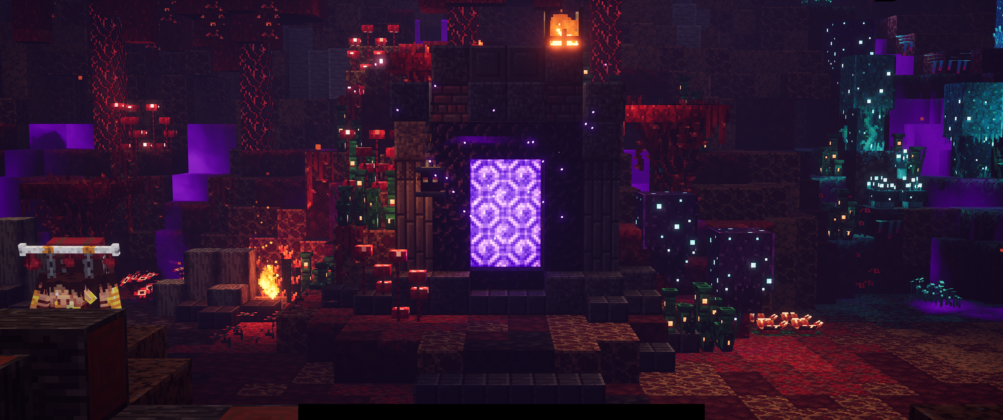 Right underneath the camp, a cave can be accessed that appears to have a warped forest-like appearance inside. This is the location of the Piglin Merchant, as well as the location of a second active Nether portal, which can be used to access Ancient Hunts. The cave is accessible through an open door, making it a structure.