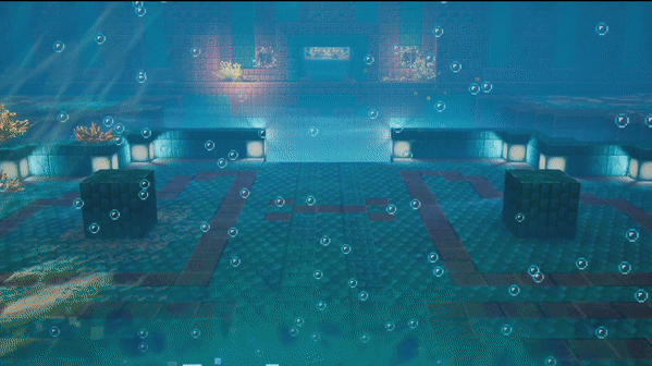 The Hidden Depths take place underwater, around a small group of islands. Underneath the largest island is a ridge filled with a coral reefs and a shipwreck, on the west and deeper below is an ocean monument that harbors an ancient guardian, and on the east is an underwater volcano surrounded by lava, glowing lanterns, and a large fossil. The missions in the Hidden Depths are huge when compared to other missions, with about fifteen secrets in the Coral Rise alone. There is a cutscene in the abyssal monument in which the ancient guardian breaks through its own lair, and starts the boss fight. It is one of the only boss fights with a cutscene, apart from the Vengeful Heart of Ender. However, unlike that one this cutscene is not a separate pre-recorded movie, but rather is directly from within the mission.