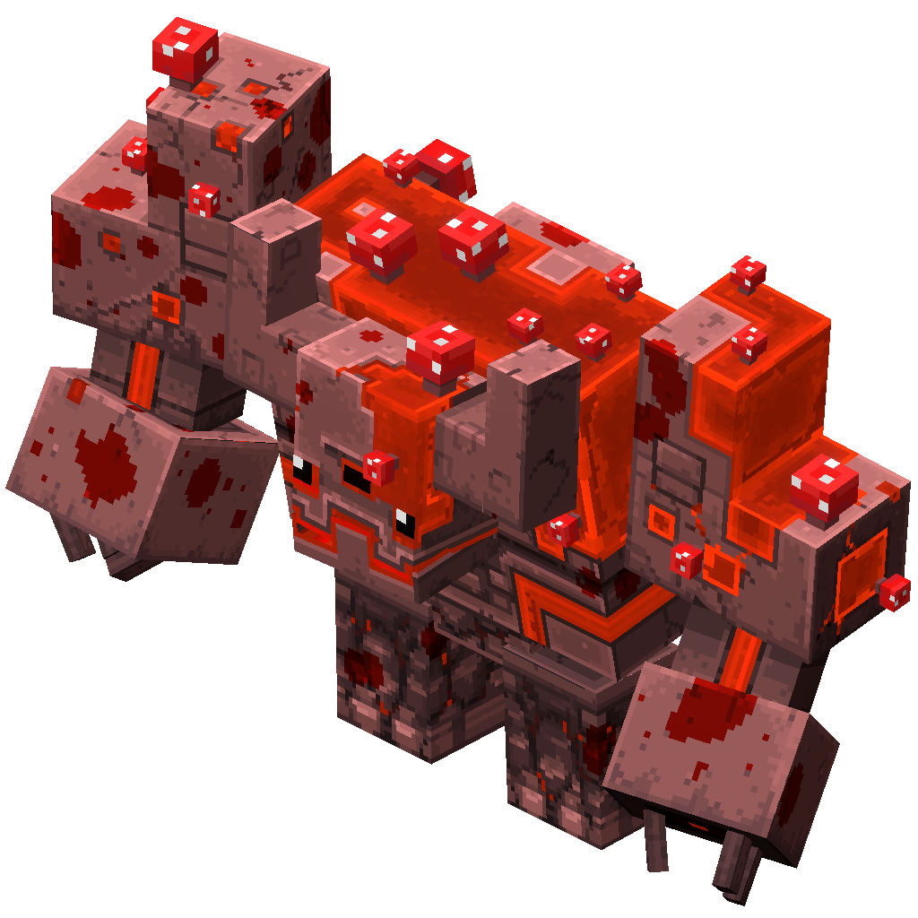 The Mooshroom Monstrosity appears to be a mechanical mob made of stone and redstone patches, as well as mushroom spores sprouting out of the Mooshroom Monstrosity's body. It appears to have multiple cracks within the body and red outlines within its torso. It has three black eyes with the third one on its forehead and a red jaw. This mob is a variation of the Redstone Monstrosity.
