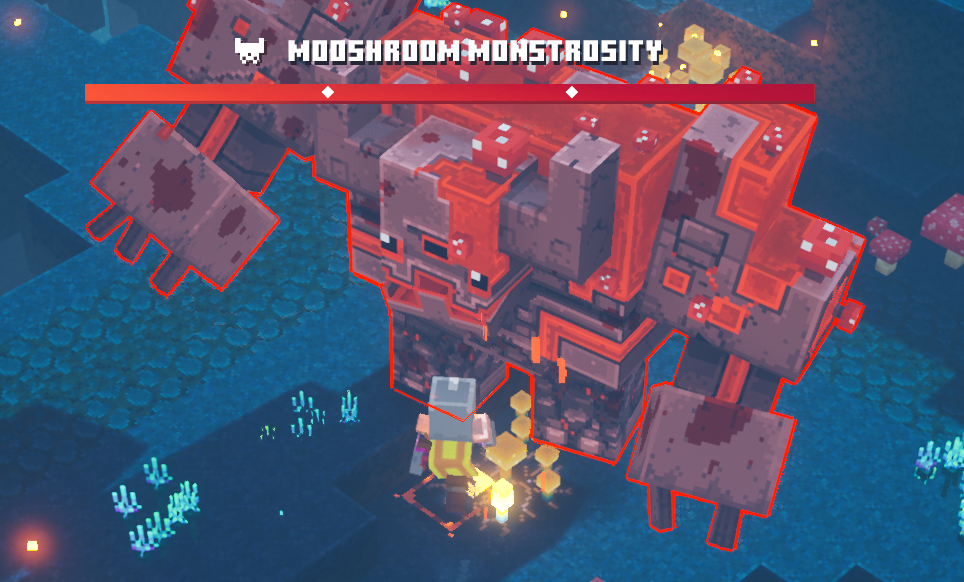 The Mooshroom Monstrosity is a boss mob in Minecraft Dungeons. It appears in the hidden dungeon ??? level as the final boss. It seems to be the remnants of a Redstone Monstrosity somehow reactivated by the mushroom spores after being defeated by the player at the Fiery Forge.