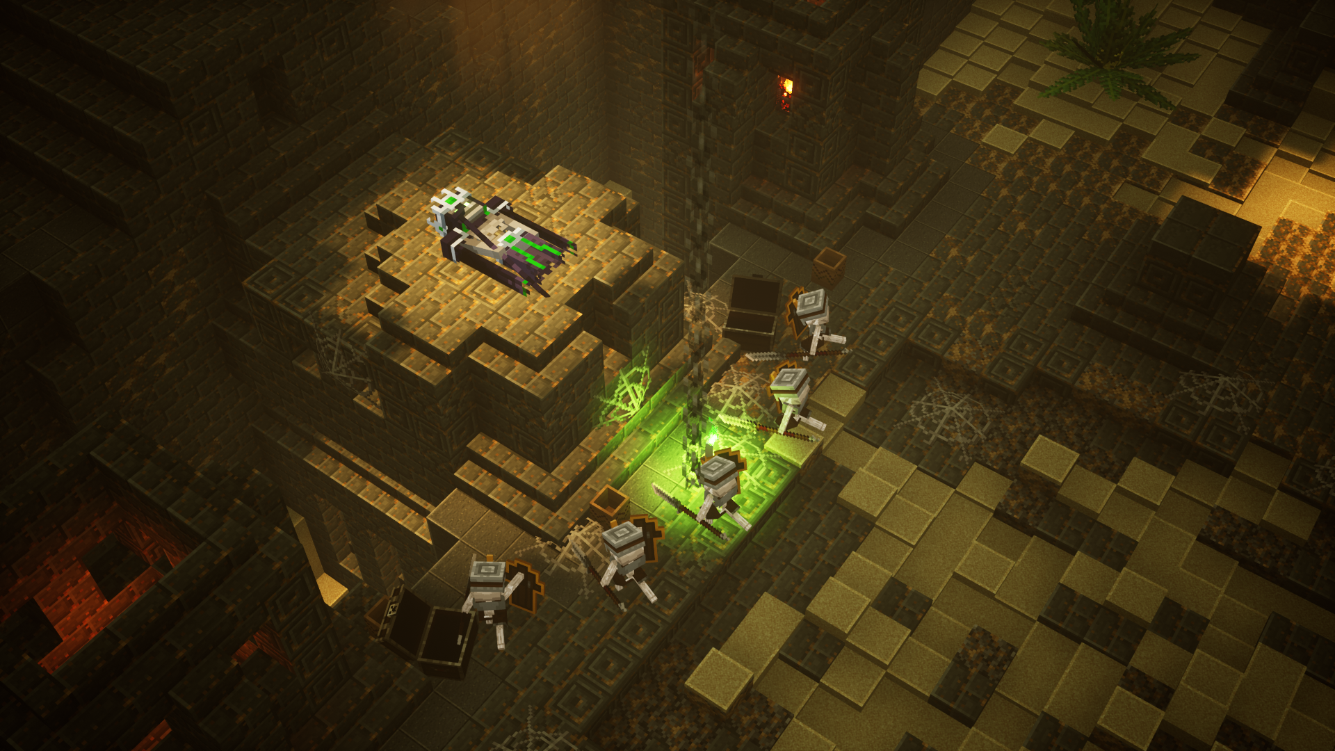In Rise of the Arch-Illager, when Archie is leading the illagers to the Squid Coast, he decides to take a wide arc around the Desert Temple. Unknown to Archie, despite this, the Nameless One knows of the abilities of the Orb of Dominance and sends husks and skeletons to follow the illagers under the cover of darkness. After the illagers launch their raid on the village and Archie is confronted by Yumi, the Undead army appears. They launch their own raid, attacking illagers, villagers, and heroes alike. Archie is shot twice by two skeletons and falls unconscious. Archie wakes up in the midst of being carried to the desert temple and the leading necromancer knocks him out with its staff. He wakes in a prison cell held by a different necromancer who leads him captive to the throne room. In the throne room, Archie meets the Nameless One in person. The Nameless One makes it clear that it desires the Orb of Dominance to make the Undead army immune to sunlight. Archie makes it clear that he will not part with the Orb of Dominance. With both of them trying to gain the upper hand in the tense conversation, they eventually come to an agreement: Archie can use the Orb of Dominance to make the Undead immune to the sunlight and the Nameless One will allow Archie to command the Undead army.