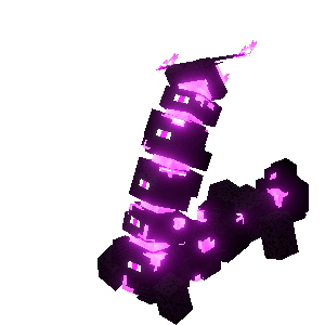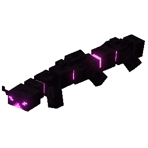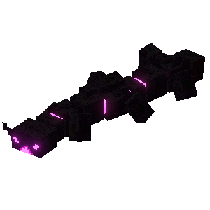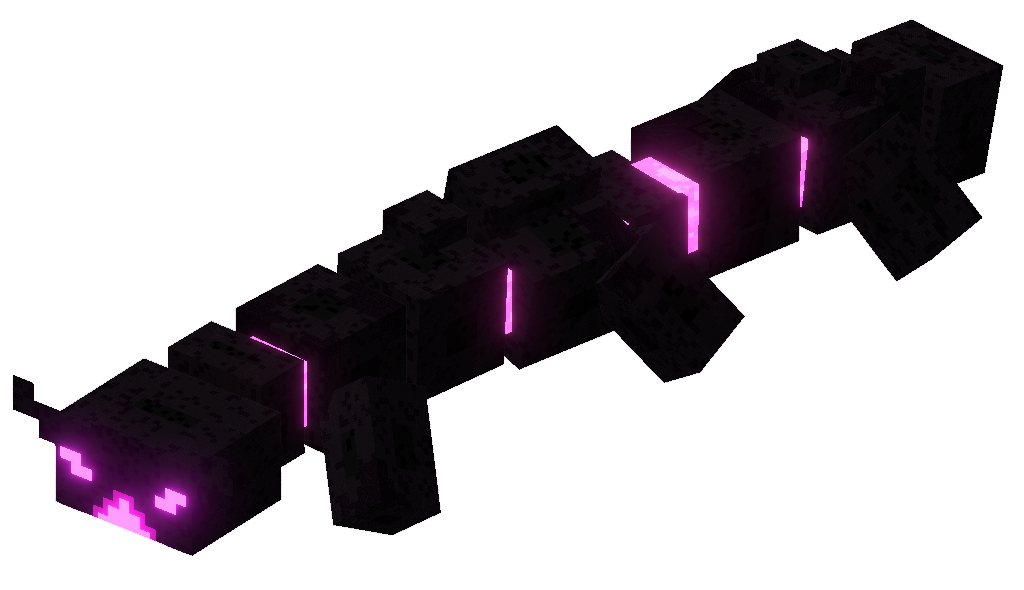 Before entering the end shrine, the Vengeful Heart of Ender first appears as a long black centipede-like creature with a segmented body, a pink energy connects each of them. It has six small legs, several pink spots all around its body and has a small two-horned head with two pink eyes and a pink mouth.