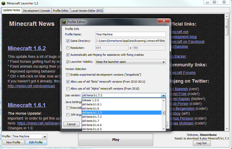 - Version, which includes access to older releases and snapshots (if enabled).