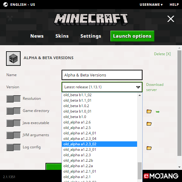The Minecraft launcher has the ability to play old Alpha and Beta versions of the game. Currently, snapshots, Alpha, Beta, and all Release versions are available to play. Four Pre-classic versions, four Classic versions, and one Infdev version are already added under the names "old-alpha version".[2] No Indev versions are currently available from the launcher.