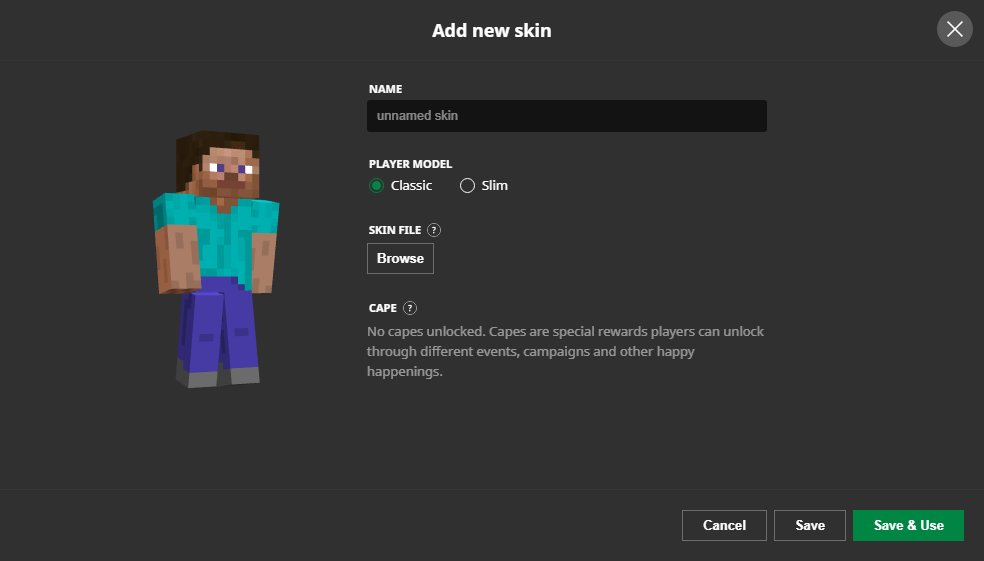 You can change or add your custom skin within the Minecraft launcher. To change or add your skin click the "Skins" button, then click the "Browse" button to navigate through your file system for your skin file. The file must have a resolution of 64×64 in order for the launcher to accept it as a skin file. Additionally, the skin file must be in a .png format. After you have found the skin file, click the "Save" button to confirm your in-game skin.