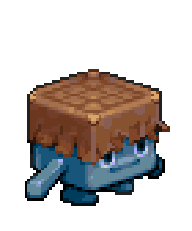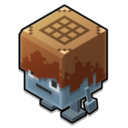 Knowledge appears like a gray-blue block of polished stone or metal, with stubby limbs and a cartoony face. They wear a raggedy brown cap with the pattern of a crafting table grid on the top.