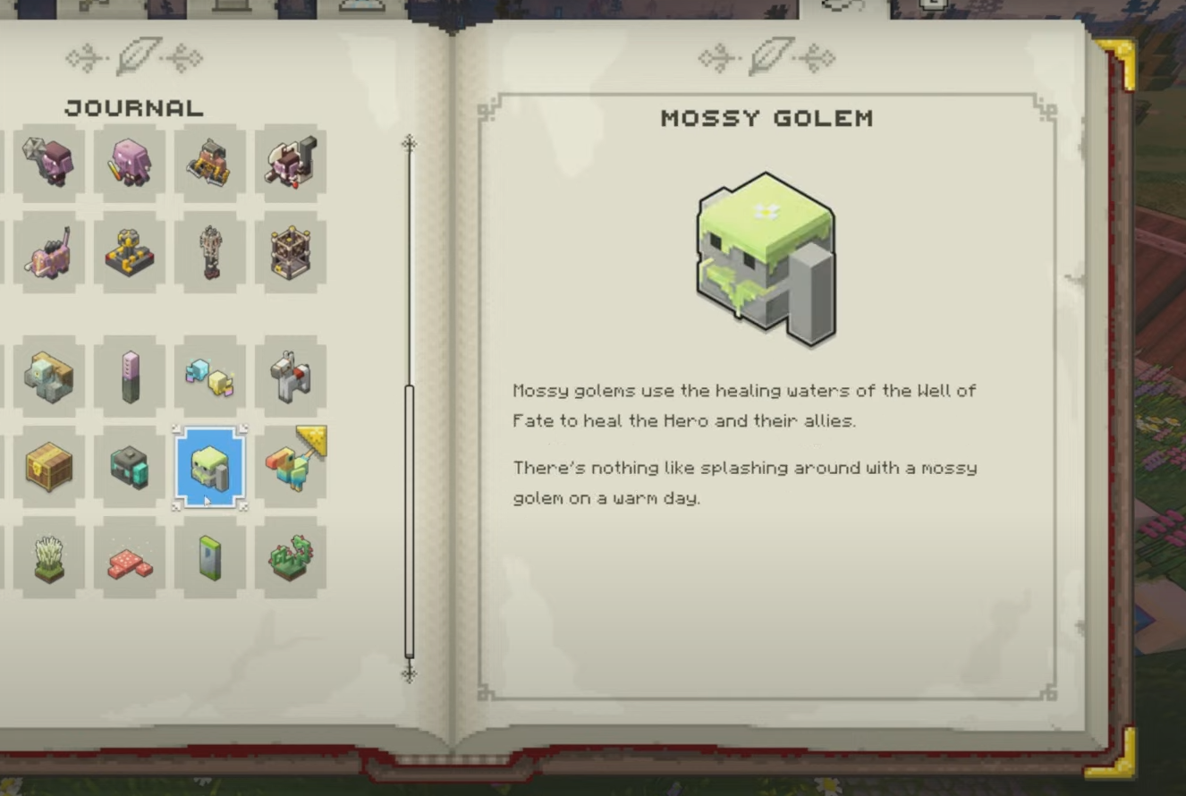 Mossy Golems spray water in an area around themselves, healing and curing status effects of any allied target within range. Once the Nether portal it was targeting was destroyed it will cheer and raise its arms up to the air as a celebration.