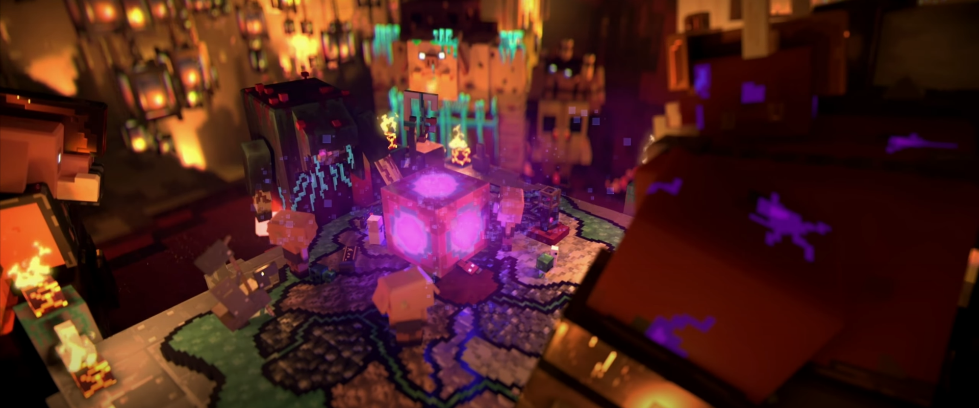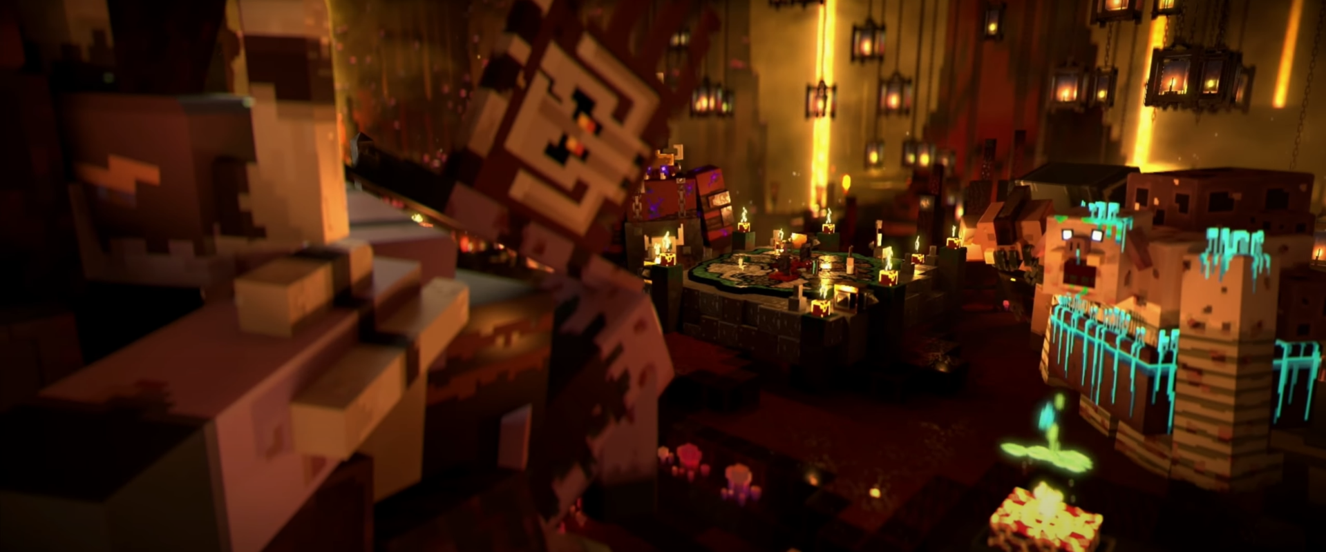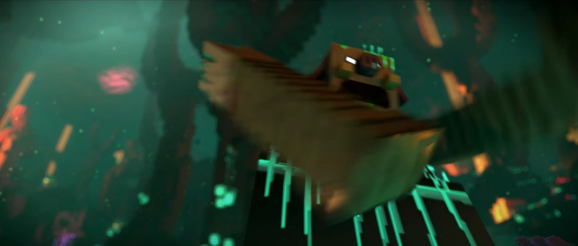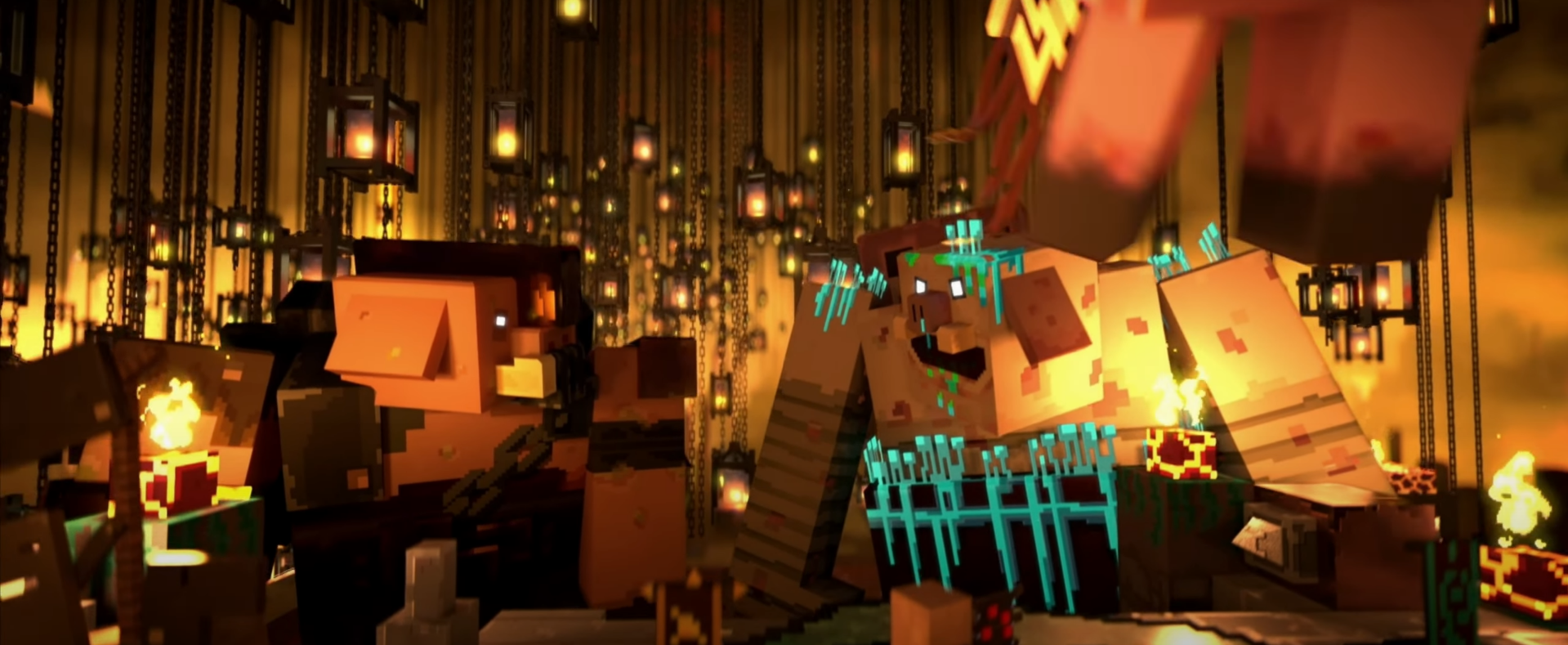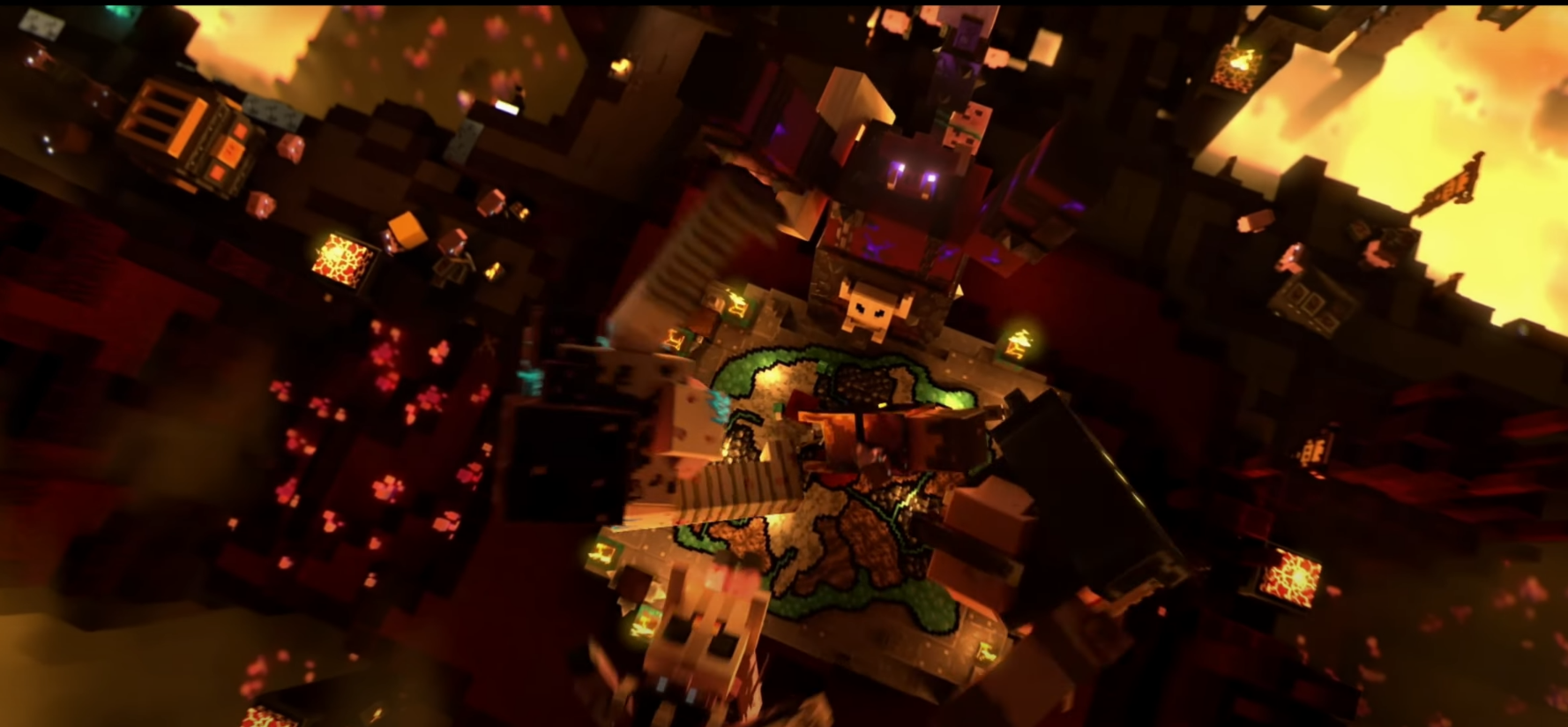 During the war the Hero successfully destroys a piglin outpost with a nether portal in it. We then cut back to the Nether where we see the Devourer in a soup bath eating spores, Overworld food and animals, a piglin approaches the Devourer to tell it that the Hero successfully destroyed a portal but it is too busy eating and a piglin with a purple flower approaches it and eats the flower along with the piglin carrying it, the Devourer spits out a spore and the piglin from the destroyed Nether portal catches it and admires then a group of piglins pile on the piglin trying to steal it. We then cut back to the Devourer eating and laughing.