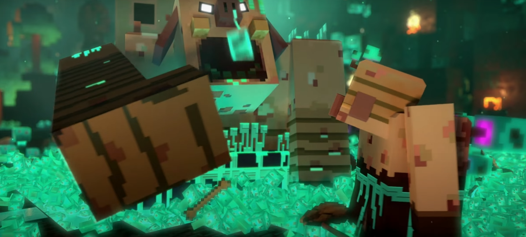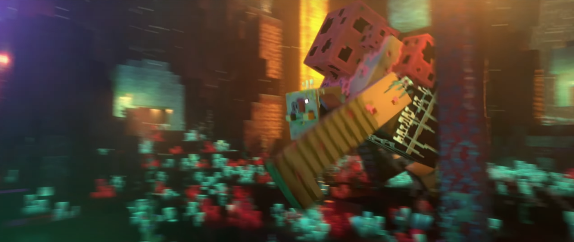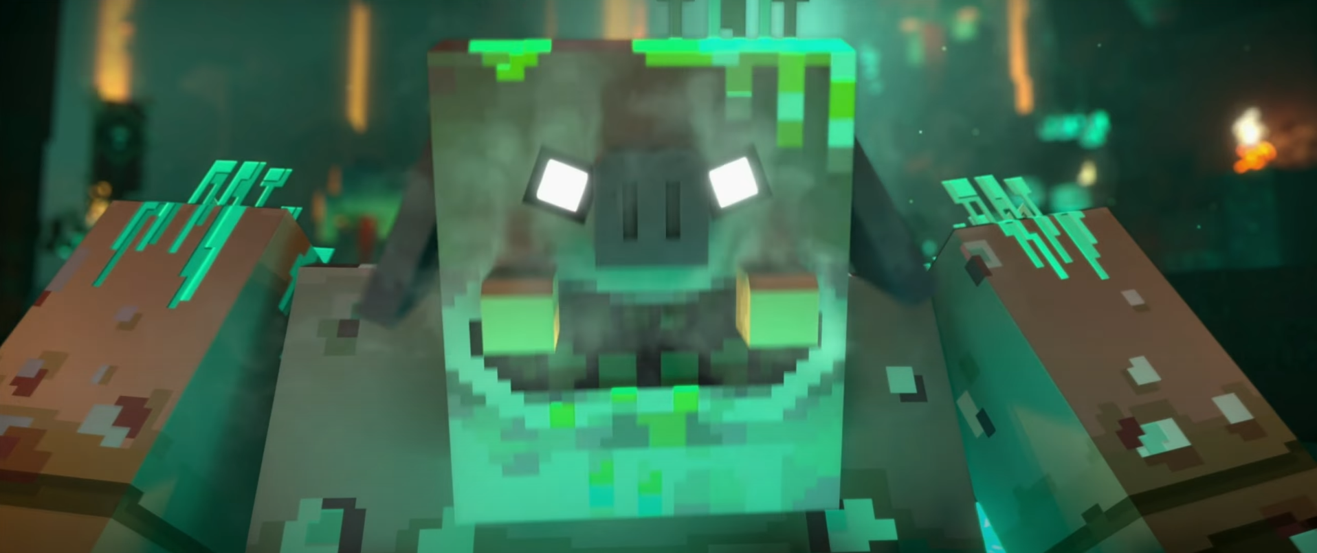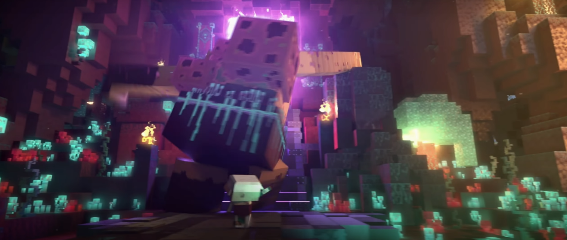 During the war the Hero successfully destroys a piglin outpost with a nether portal in it. We then cut back to the Nether where we see the Devourer in a soup bath eating spores, Overworld food and animals, a piglin approaches the Devourer to tell it that the Hero successfully destroyed a portal but it is too busy eating and a piglin with a purple flower approaches it and eats the flower along with the piglin carrying it, the Devourer spits out a spore and the piglin from the destroyed Nether portal catches it and admires then a group of piglins pile on the piglin trying to steal it. We then cut back to the Devourer eating and laughing.