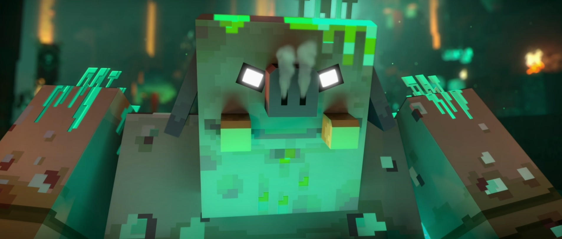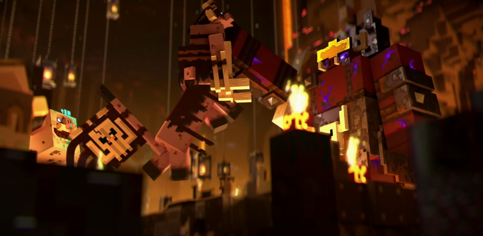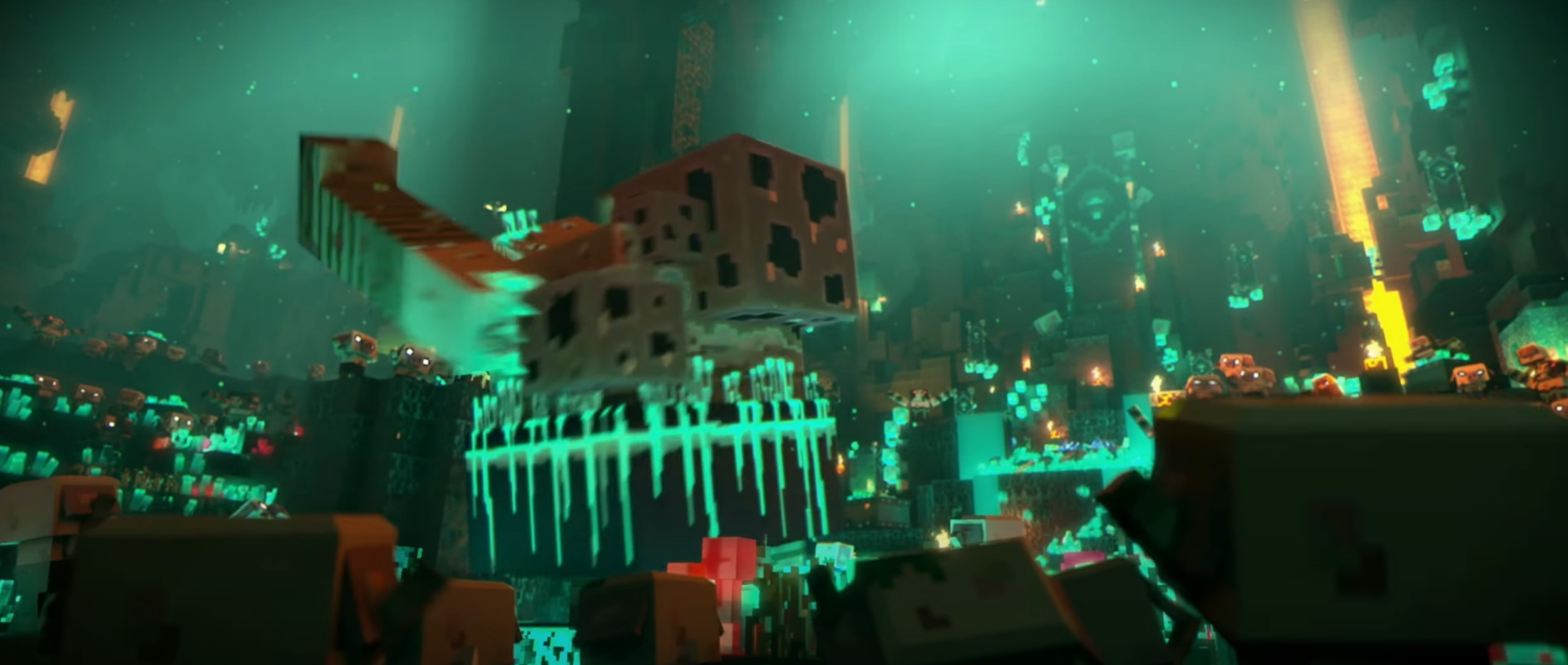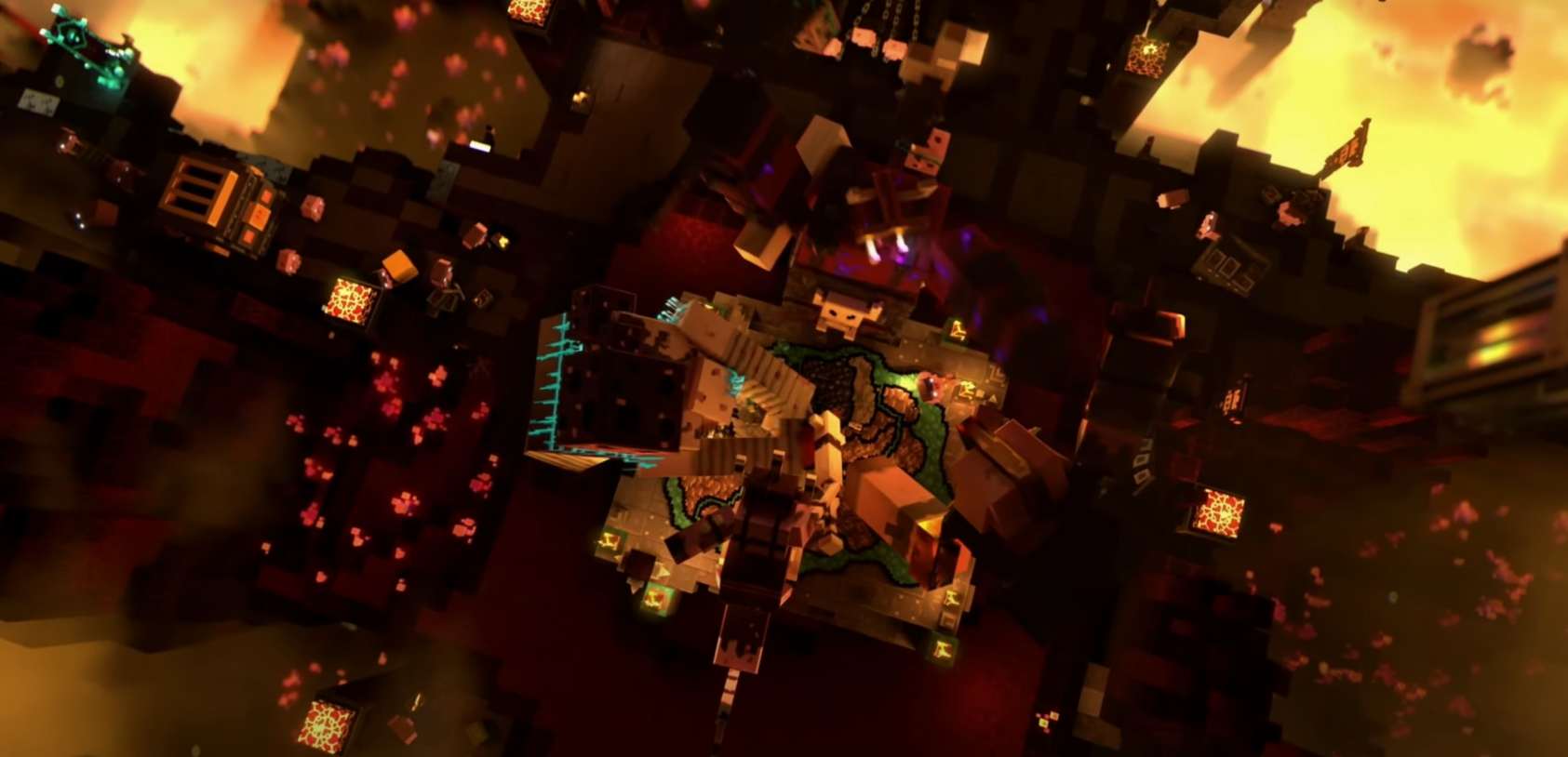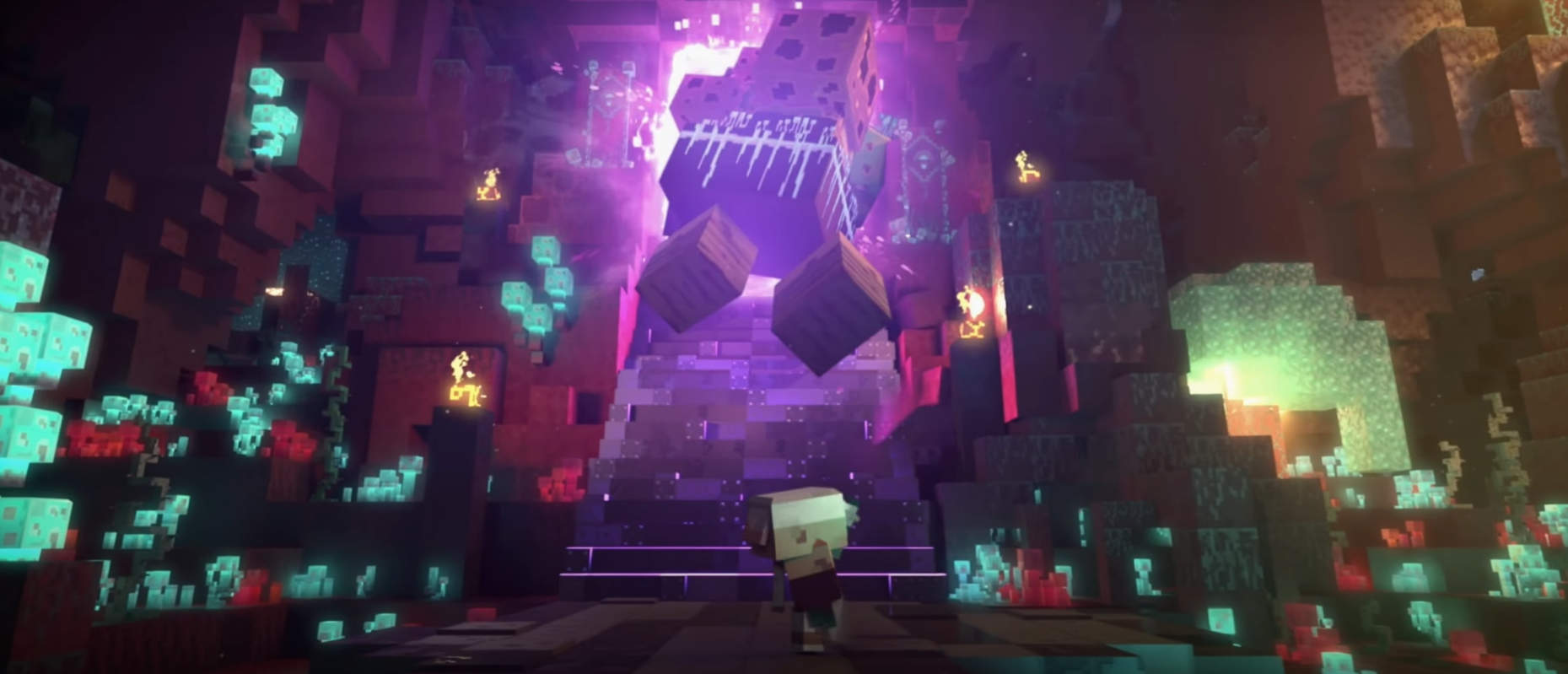 During the war the Hero successfully destroys a piglin outpost with a nether portal in it. We then cut back to the Nether where we see the Devourer in a soup bath eating spores, Overworld food and animals, a piglin approaches the Devourer to tell it that the Hero successfully destroyed a portal but it is too busy eating and a piglin with a purple flower approaches it and eats the flower along with the piglin carrying it, the Devourer spits out a spore and the piglin from the destroyed Nether portal catches it and admires then a group of piglins pile on the piglin trying to steal it. We then cut back to the Devourer eating and laughing.