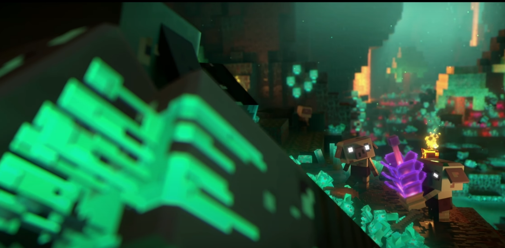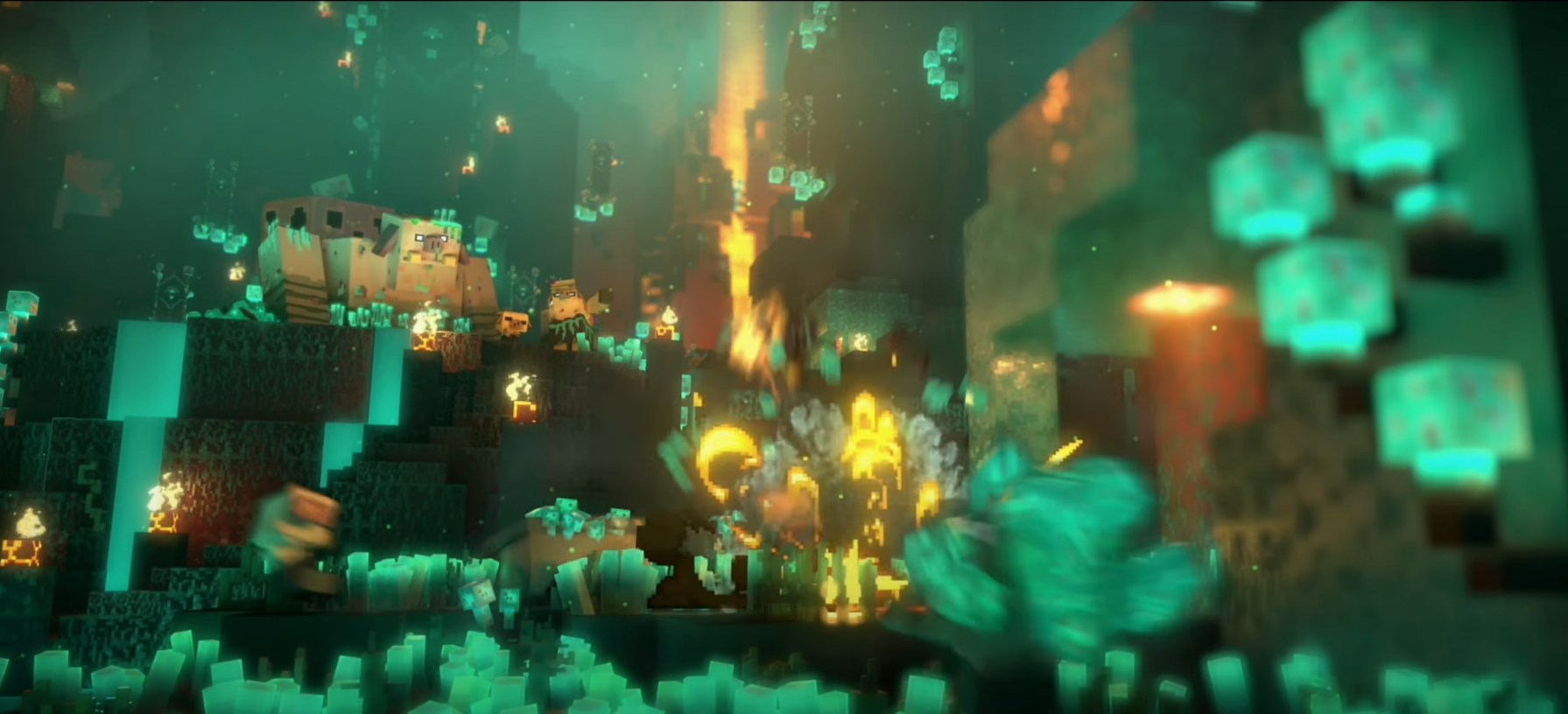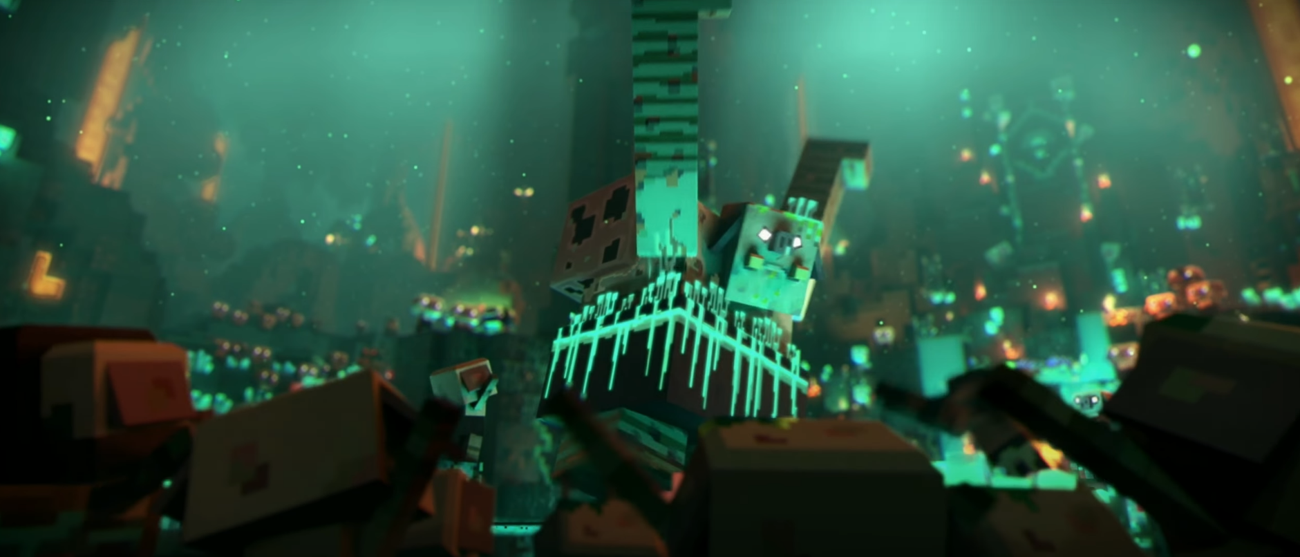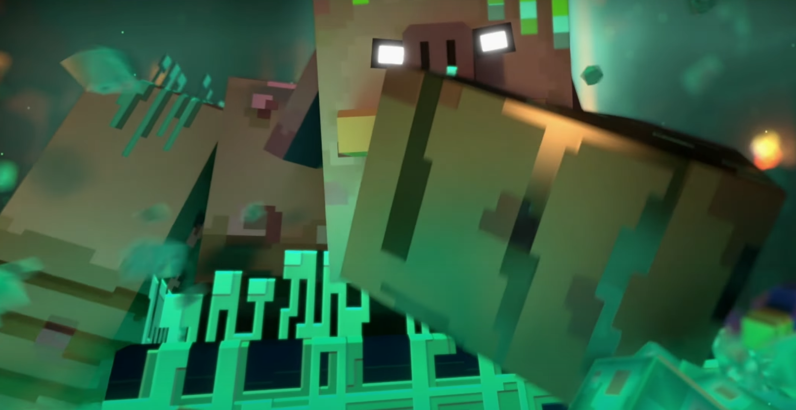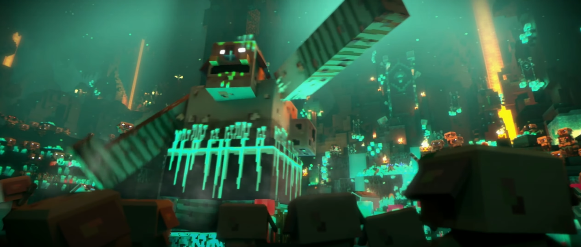 During the war the Hero successfully destroys a piglin outpost with a nether portal in it. We then cut back to the Nether where we see the Devourer in a soup bath eating spores, Overworld food and animals, a piglin approaches the Devourer to tell it that the Hero successfully destroyed a portal but it is too busy eating and a piglin with a purple flower approaches it and eats the flower along with the piglin carrying it, the Devourer spits out a spore and the piglin from the destroyed Nether portal catches it and admires then a group of piglins pile on the piglin trying to steal it. We then cut back to the Devourer eating and laughing.