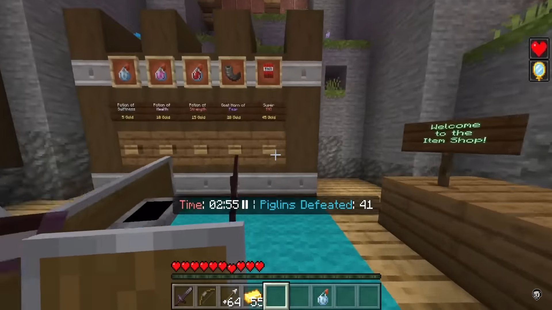 The Item Shop is a location that is located behind the Well of Fate. Players can obtain Gold from defeated Piglins, which can then be used to buy items from the Item Shop. The items that are obtainable include the following: