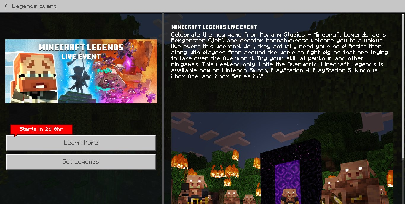 The Minecraft Legends Live Event was an in-game event server where players could experience a recreation of Minecraft Legends.