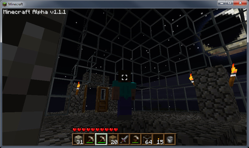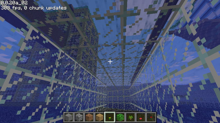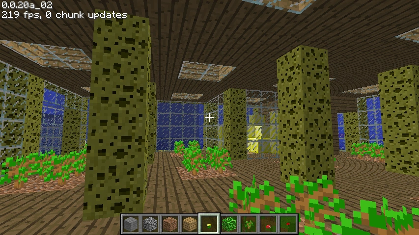 From a well-publicised version to one far more mysterious, next we have Alpha v1.0.2. This one is so elusive that Notch himself didn't mention it once, instead skipping straight to v1.0.2_01 for the announcement. This version is believed to have been the one to introduce the game changes announced for v1.0.2_01, so (reword?) having them be credited to the version directly after doesn't imply the most promising of release windows. We have two videos of this version, a mean redstone demo from TheWarlemming and a chilled minecart ride courtesy of norterrible, as well as a plethora of images from a greenhouse as shown at the start. show the remainder of the images An interesting thing you might notice about these images is that there are torches clearly placed on glass. It's not known if this version actually allowed for that by default, or if one of many block placement glitches were used to achieve this, but only obtaining this version itself will provide us all with conclusive evidence. show one or two of these images at the start: https://cdn.discordapp.com/attachments/399390463930400778/708412076820791366/greenhouse1.png https://cdn.discordapp.com/attachments/399390463930400778/708412139525636168/greenhouse2.png https://media.discordapp.net/attachments/399390463930400778/708412200103968880/greenhouse3.png https://cdn.discordapp.com/attachments/399390463930400778/708412240096657518/greenhouse4.png https://cdn.discordapp.com/attachments/399390463930400778/708412319343837236/greenhouse5.png show this video after the images, around the "Notch himself" part: https://youtu.be/HXujC4-mMmQ show a clip from the first half of this after the above video ends: https://youtu.be/aTkEb1akKcs