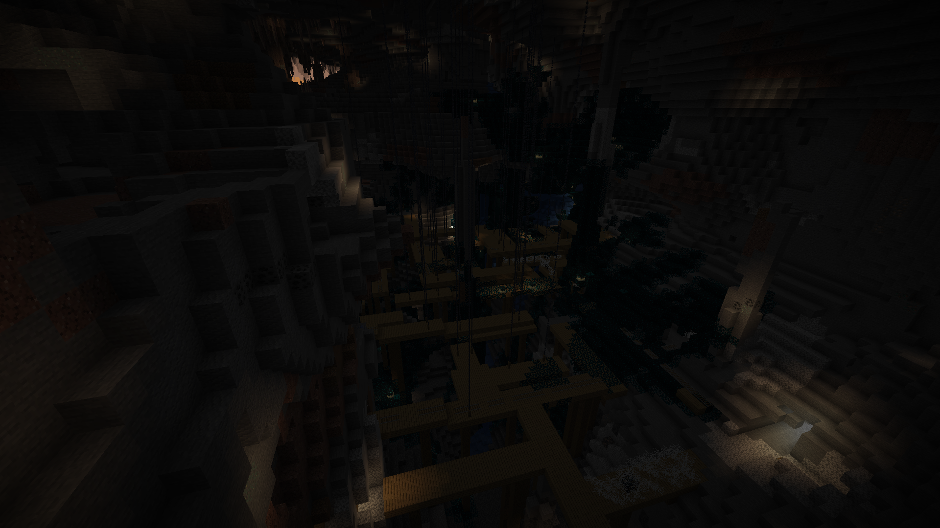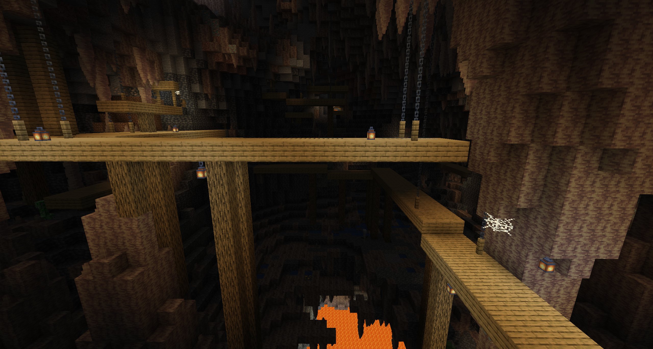 A mineshaft generating across a large cave.