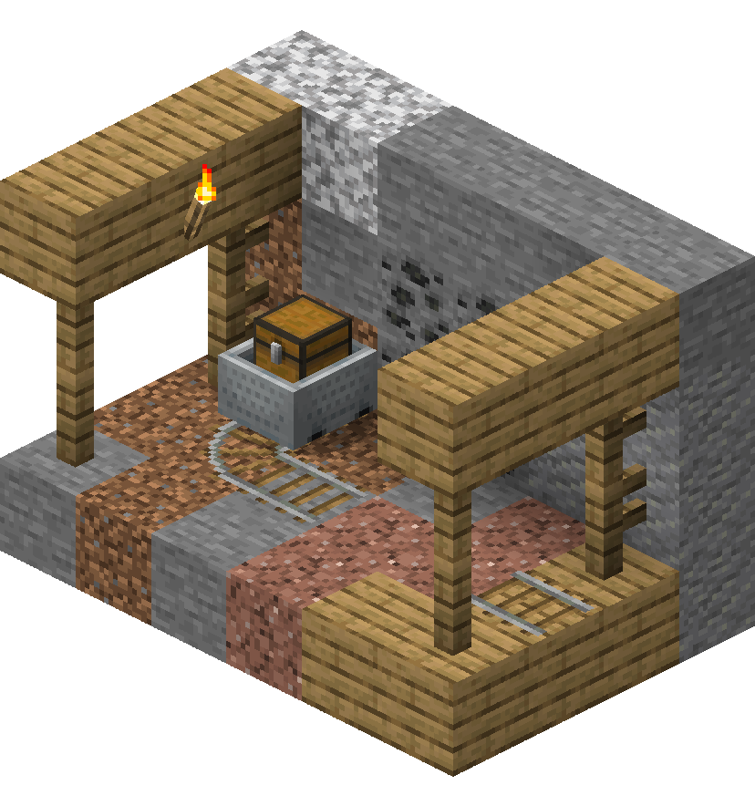 - Corridors - 3×3 block corridors featuring supports made from oak fences and wood planks (sometimes complementary with torches), broken rails, minecarts with chests (containing resources) and cave spider spawners surrounded by cobwebs. On long corridors, supports are placed four blocks away from each other, and some have a missing plank on the middle. Underground tunnels can have imperfections on the upper side, sometimes occupying the area of the missing plank.