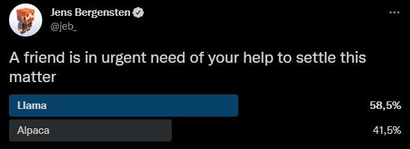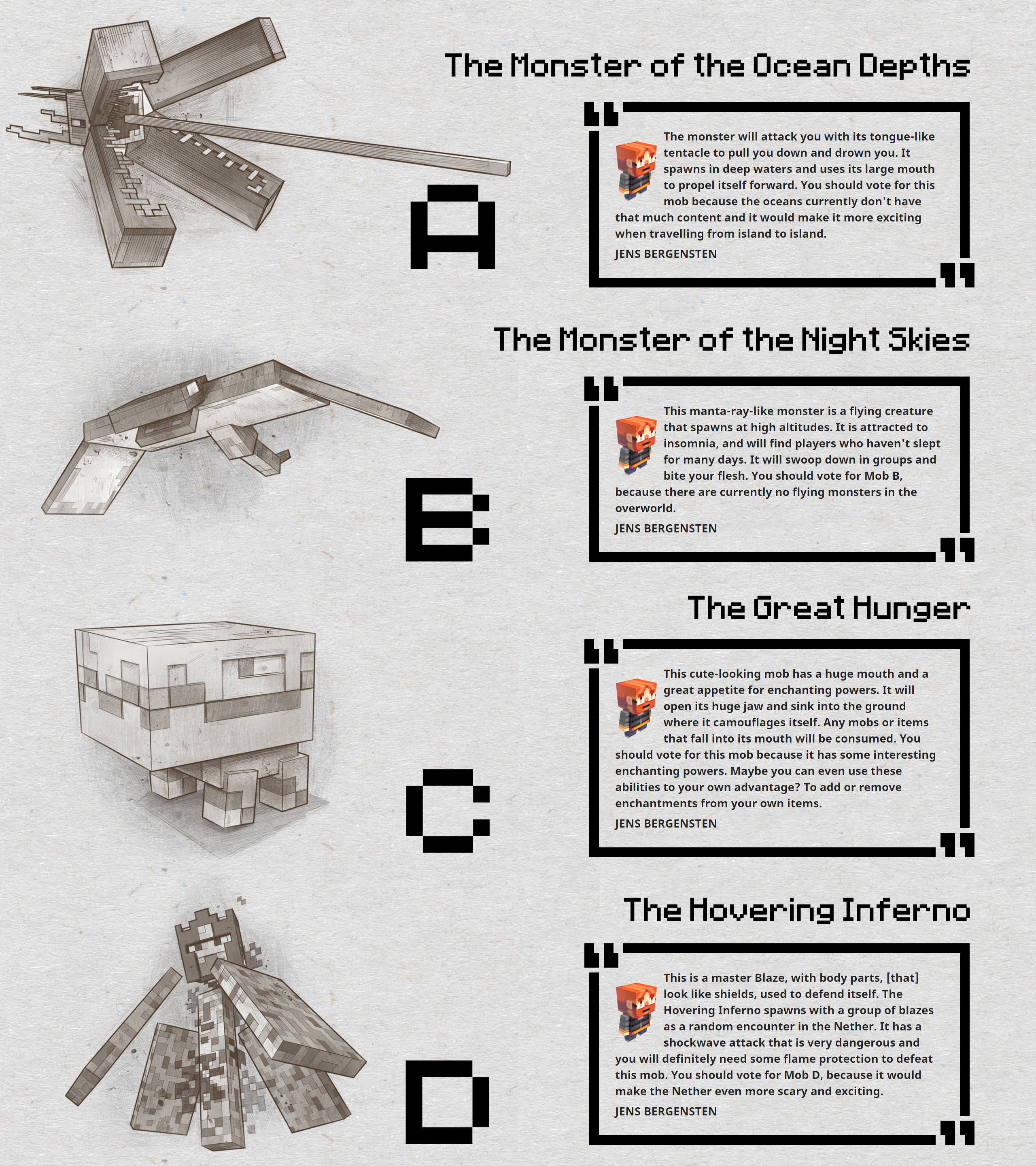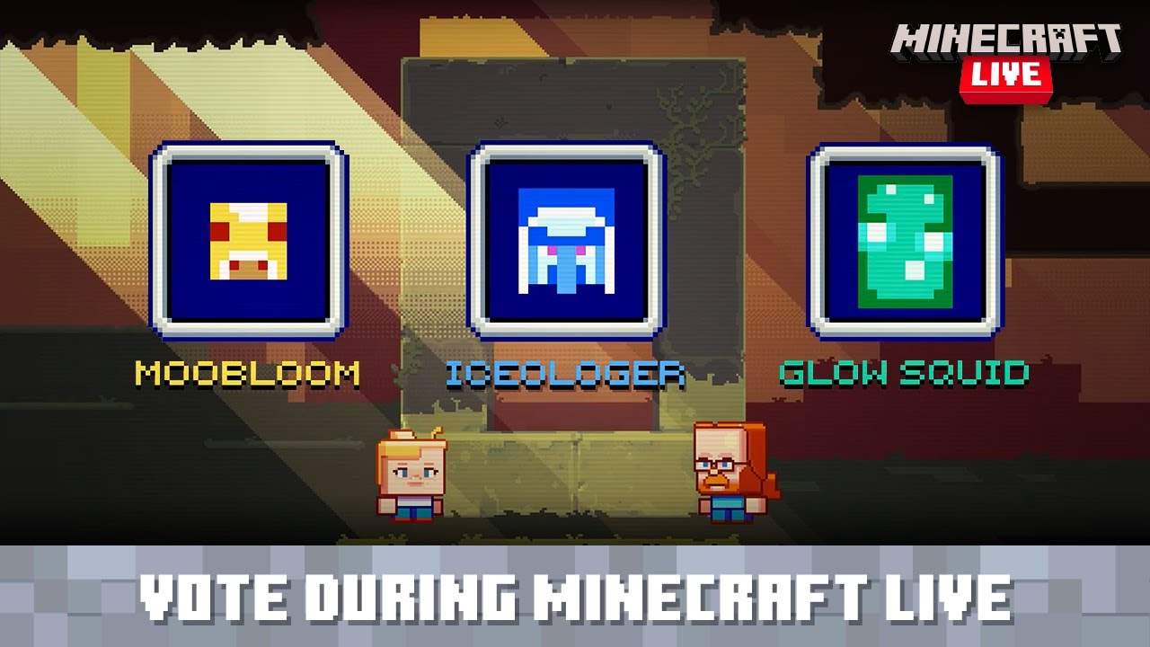 In 2016, Jeb held an informal poll on Twitter in which the public voted on adding the llama to Minecraft over the alpaca.[3][4] In the six annual Minecraft events MINECON Earth 2017, MINECON Earth 2018, MINECON Live 2019, Minecraft Live 2020, Minecraft Live 2021 and Minecraft Live 2022, the public also voted on a mob to be added to Minecraft. In the first vote, the winner was the phantom (then known as "Mob B" or "The Monster of the Night Skies"). In the second, the winner was the taiga biome and the fox. In the third, the winner was the mountain biome and the goat. In the fourth, the winner was the glow squid. In the fifth, the winner was the allay. In the sixth, the winner was the sniffer. And In the seventh, the winner was the armadillo. Shortly before the second vote, the China Edition also had a mob vote, the winner of which was the panda. Shortly after the second vote, there was also a vote for which new cat skin would be added, the winner of which was Jellie.