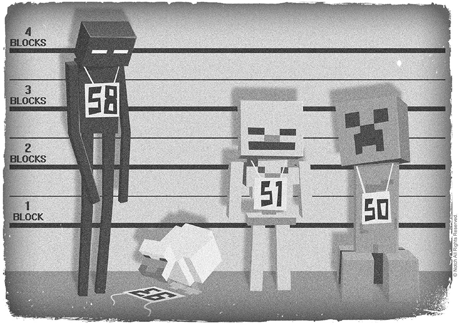 Official T-shirt artwork "Lineup" featuring hostile mobs as well as a chicken. Made by JINX.