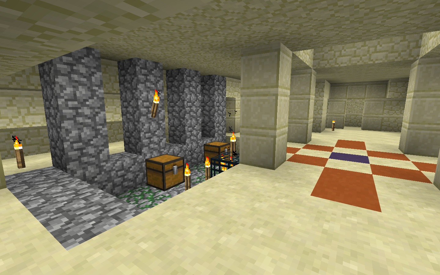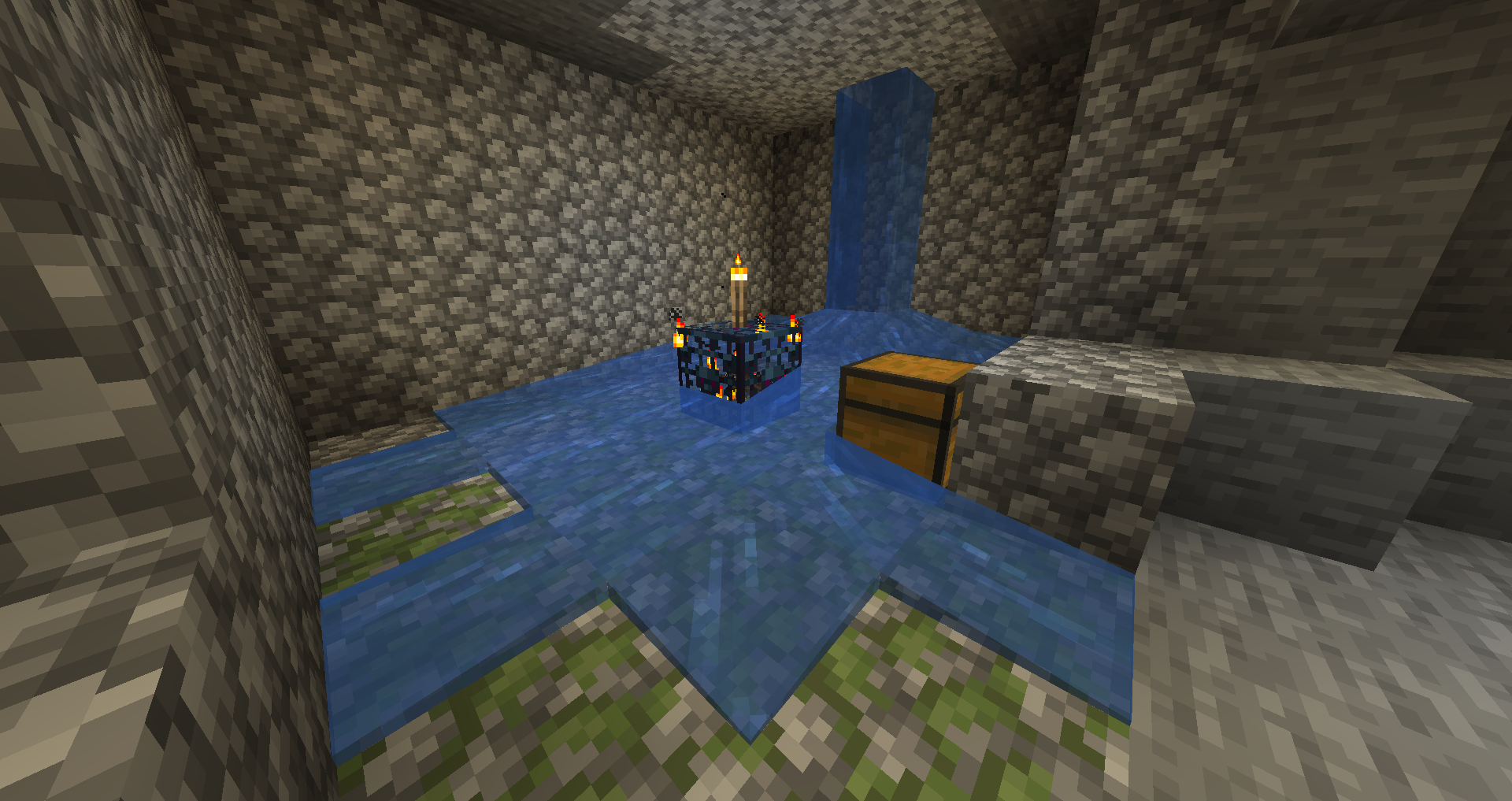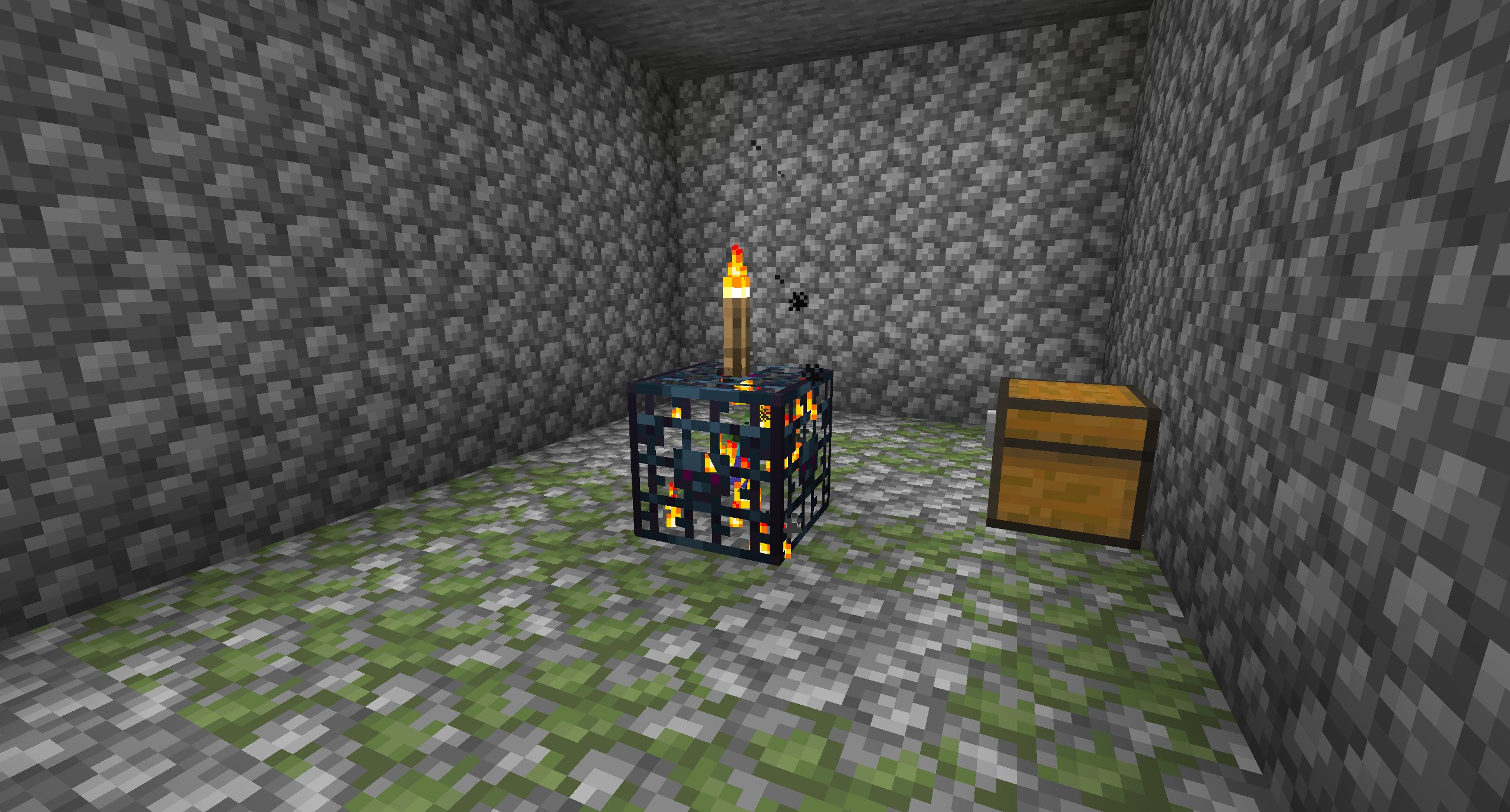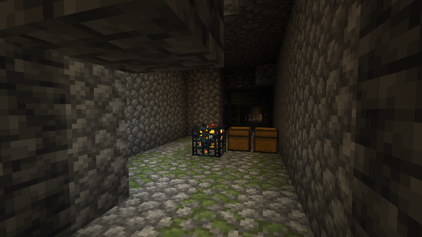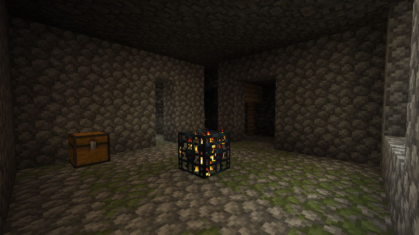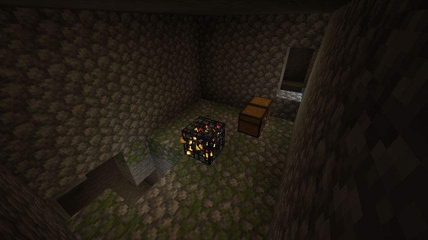 Monster rooms are small rooms made of cobblestone and mossy cobblestone and contain a monster spawner and up to 2 chests. Finding a monster room without a chest is unlikely but possible. Additionally, there is a rare chance of a monster room being found without a monster spawner. Occasionally, a monster room generates with its chests in such a way as to create a double chest. Monster rooms generate with either a zombie (50% chance), skeleton (25% chance), or spider (25% chance) monster spawner. The monster spawner is always in the center of the monster room room, with chests located around the walls of the room (large chests can connect with the short side against the wall). Each block of the floor has a 25% chance of being cobblestone and a 75% chance of being mossy cobblestone.