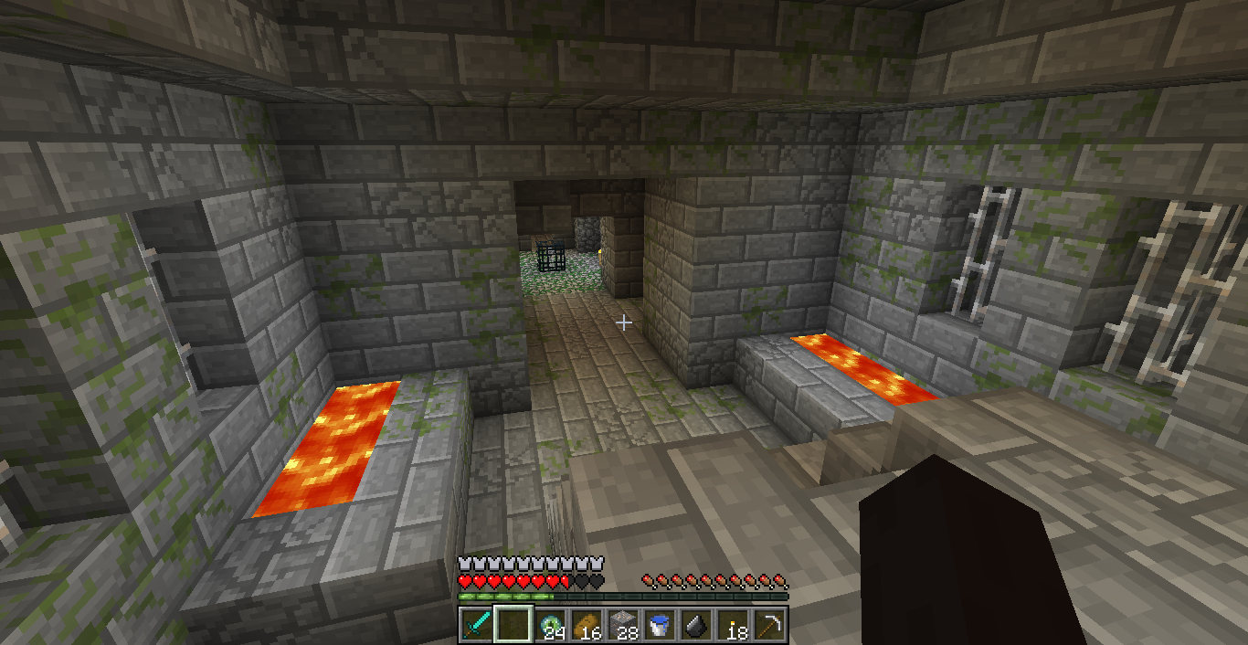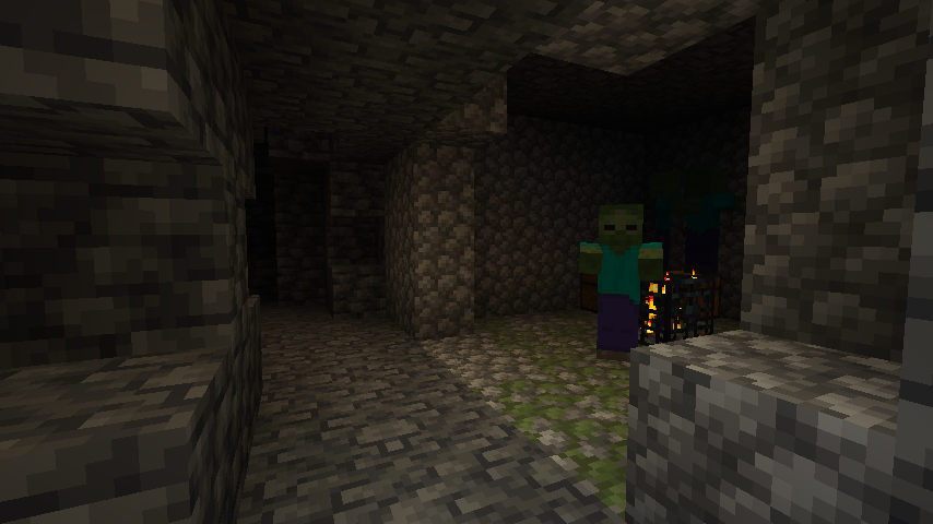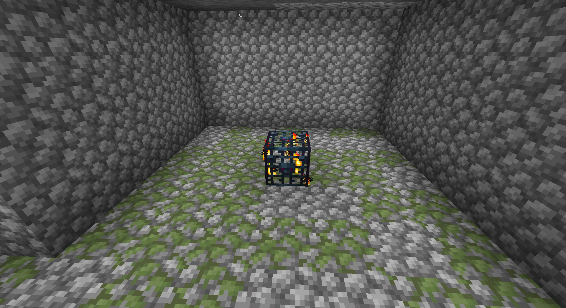 The monster room is a small building in the Overworld where a monster spawner that produces either zombies, skeletons or spiders is found in the middle of a room with cobblestone lateral walls and cobblestone mixed with mossy cobblestone floors.