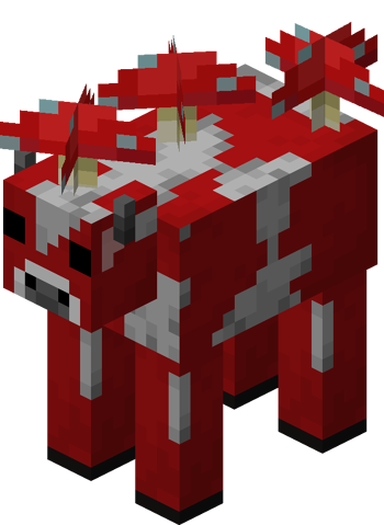 Mooshrooms are Cows spawned in the Mushroom Biome, covered with red mushroom growths. They have 2 mushrooms on their body and one on their head. The player can shear them for 2-5 red mushrooms, turning them back into normal cows. If killed, they drop the same items as normal cows. Using a bowl on them gives the player Mushroom Stew. Mooshrooms very rarely can be found outside of Mushroom Biomes.