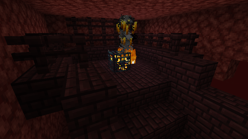 - Up to 2 blaze spawner platforms: structures consisting of three full-block "stairs" leading to a small platform fenced with nether brick fence, with a blaze spawner in the center.