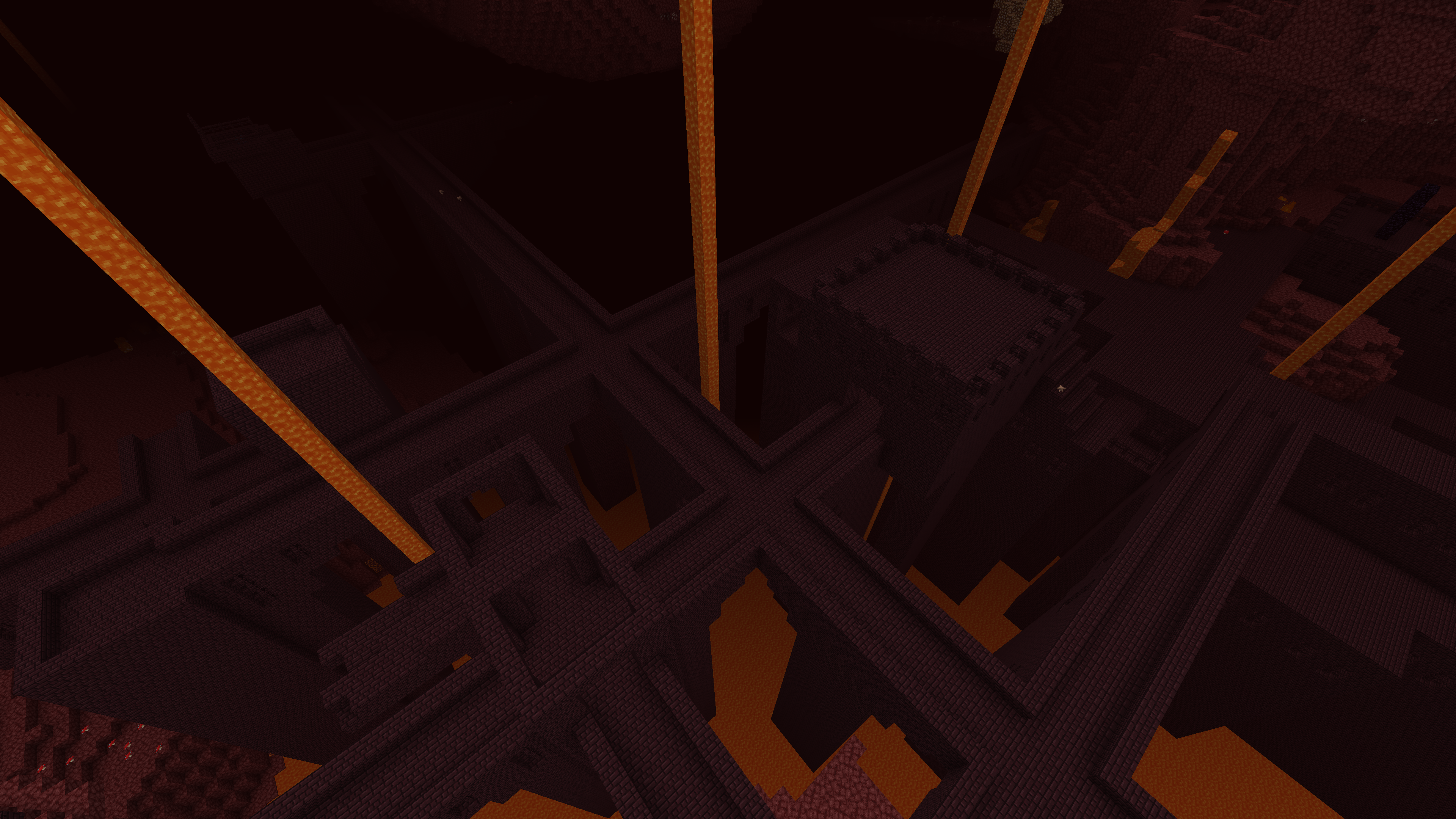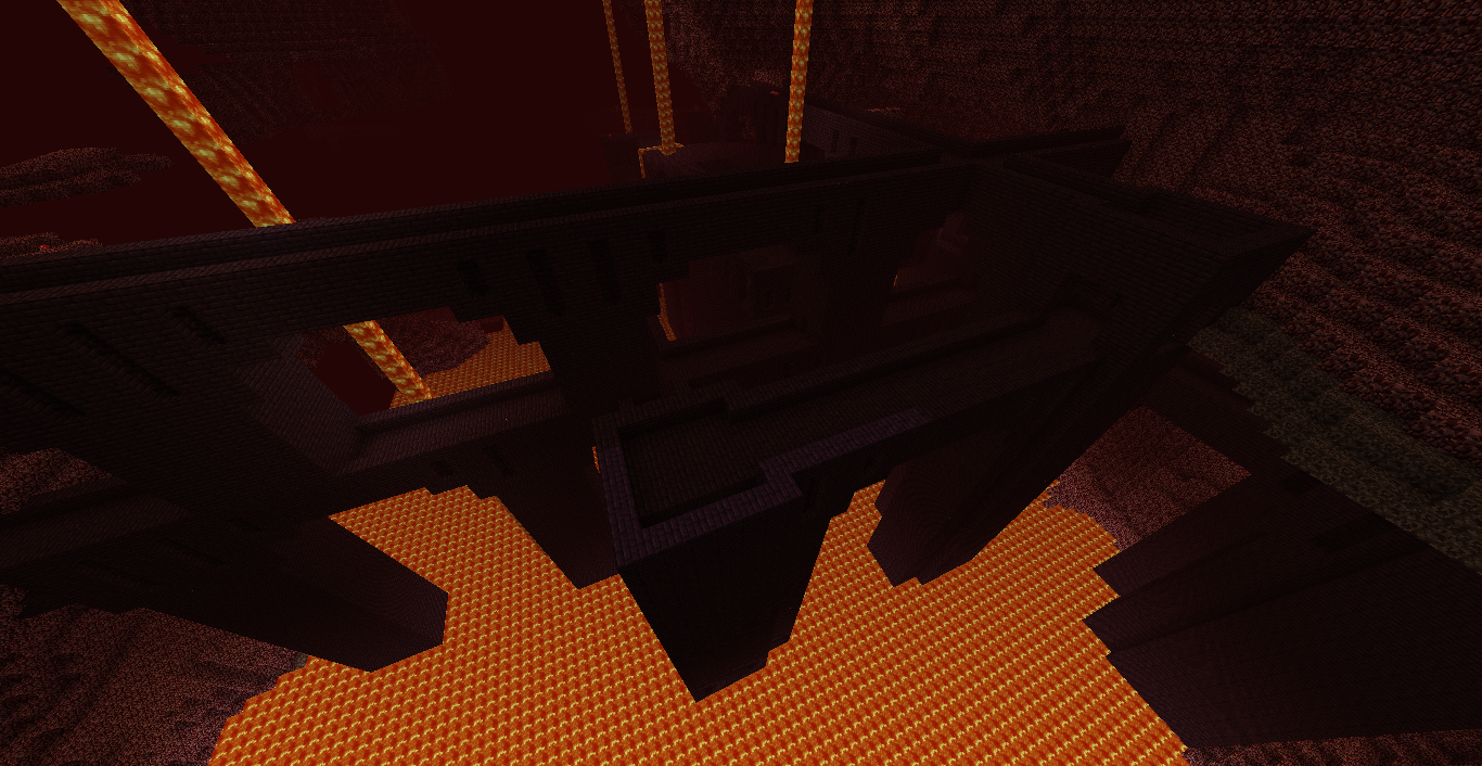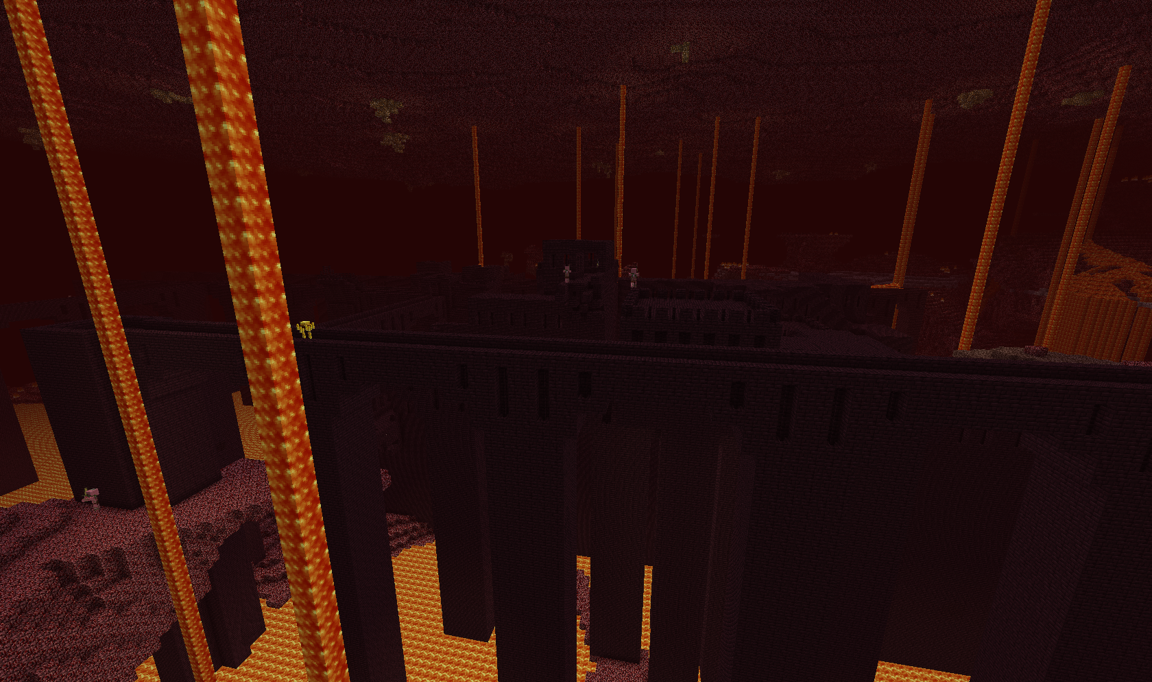 Nether fortresses are large complexes composed of nether bricks that are supported by pillars that tower high above the lava seas.