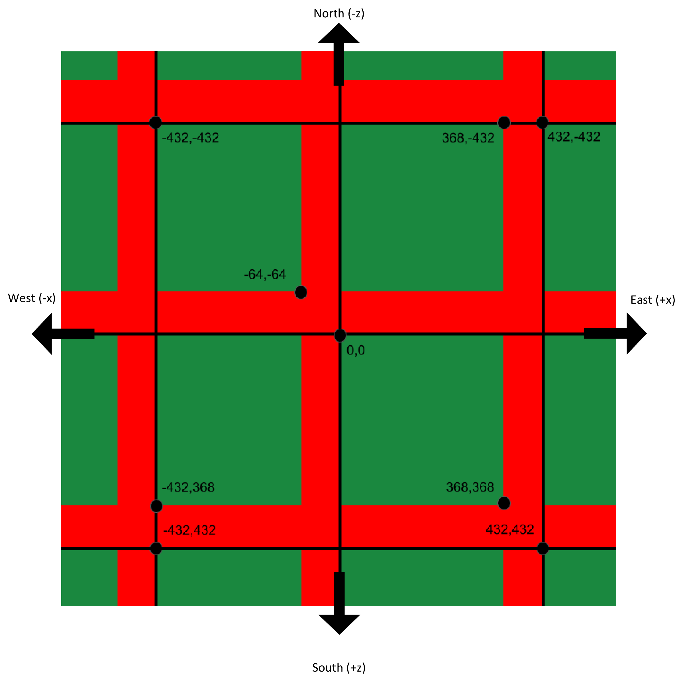 The nether structure generation in Java Edition. The black lines represent each region and the dots represent coordinates. The green color is where they can generate and red is where they cannot.
