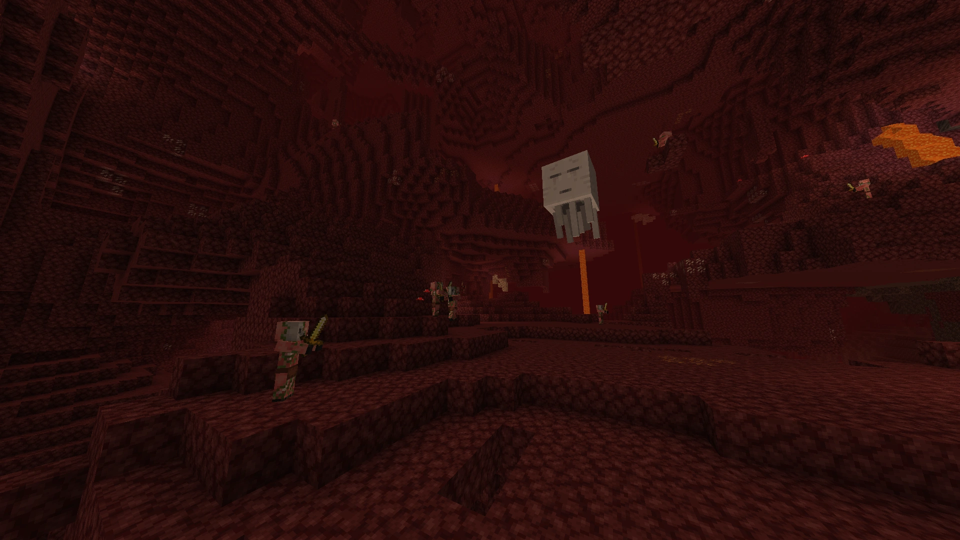 Most of the Nether’s residents can be found throughout the maroon-tinted wasteland including: Ghasts, zombified piglins, magma cubes, striders, piglins and the occasional enderman. Nether fortresses and bastion remnants are present as well.
