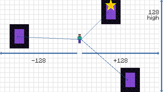 Starting at these destination coordinates, the game looks for all nearby portal points of interest (POI). The point of interest can be within 257×257 blocks in the Overworld and 33×33 blocks in the Nether[3] centered on the converted coordinate and the full map height.