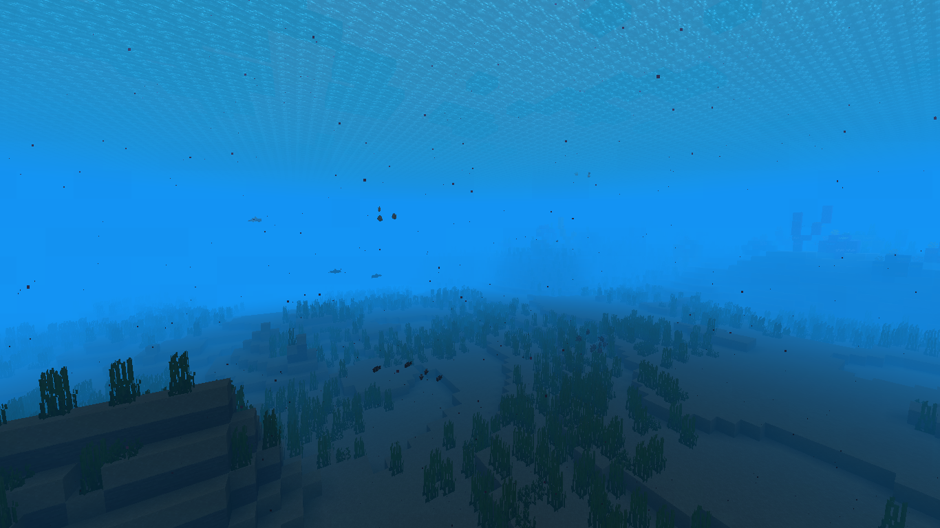 Oceans are vast expanses of water, going from sea level all the way down to the ocean floor, which is at a depth of roughly Y=45 for normal oceans, or Y=30 for deep variants. The seafloor is fairly hilly, featuring multiple peaks and valleys, and is mostly covered by a one-block layer of gravel or sand, though some clay, dirt, gravel and sand patches may generate near the peaks. Ravines can occasionally generate on the ocean floor, forming underwater trenches. Some seafloor peaks may reach high enough to form islands on the surface of the ocean; these islands are typically small and may have very sparse vegetation with very little grass and oak trees. The seafloor is often covered with seagrass and kelp, with "forests" of kelp frequently reaching close to or even touching the water's surface. Fish, squid and dolphins frequently spawn within oceans. Shipwrecks and ocean ruins generate within all oceans, while deep ocean variants can occasionally generate ocean monuments. The regular ocean variant mainly generates when bordering on land, while deep variants generates when away from land.