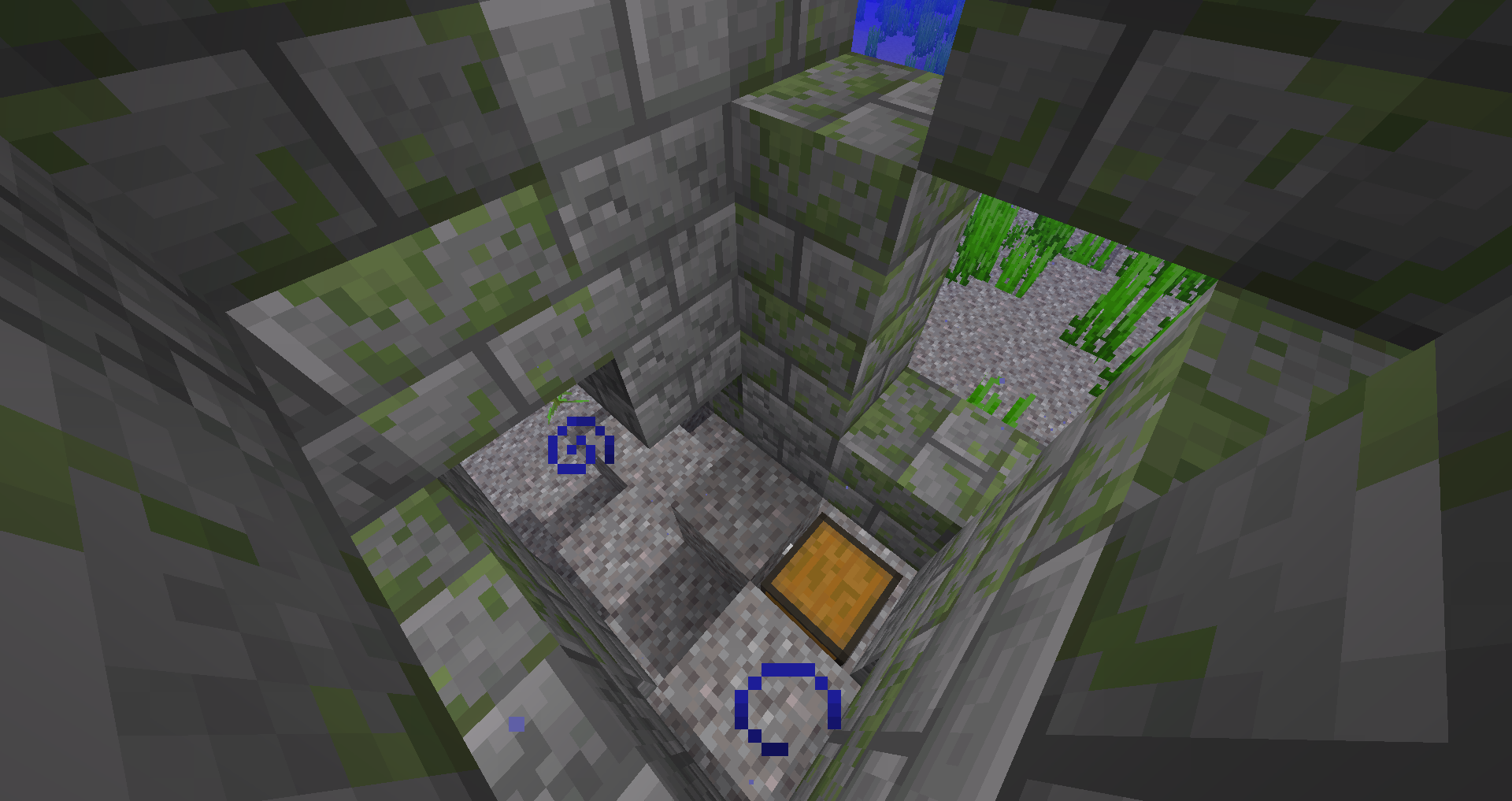 An underwater ruin in Bedrock Edition that generated completely on land. Note the waterlogged chest and the water block above it that hasn’t been updated.